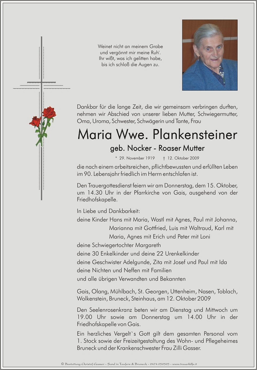 Den Trauergottesdienst feiern wir am Donnerstag, dem 15. Oktober, um 14.30 Uhr in der Pfarrkirche von Gais, ausgehend von der Friedhofskapelle.