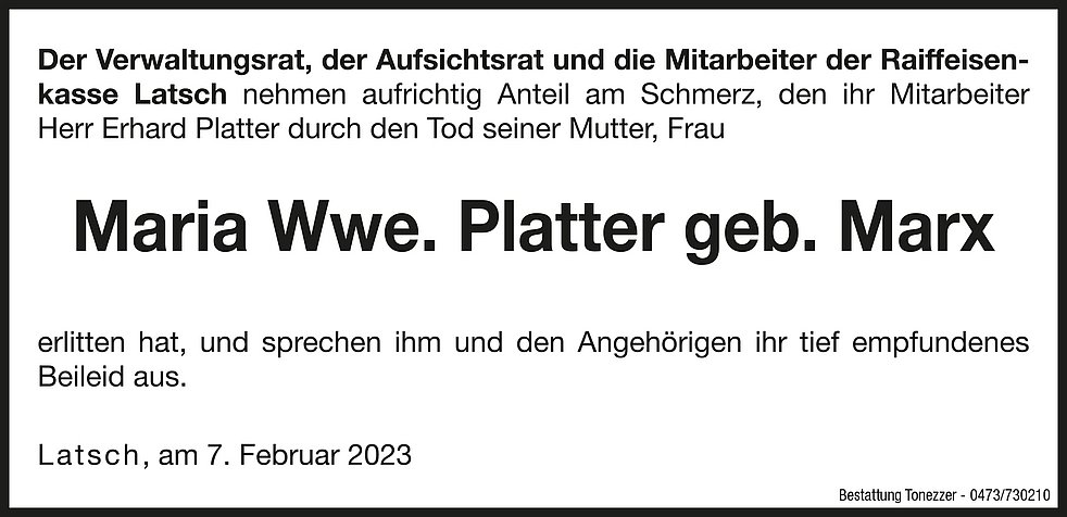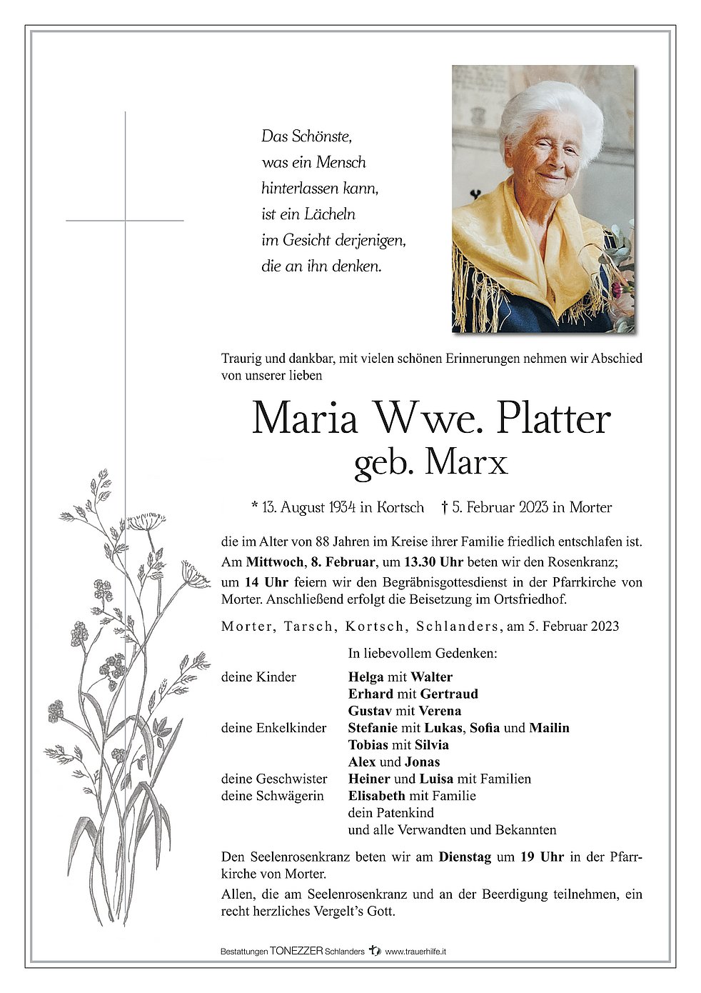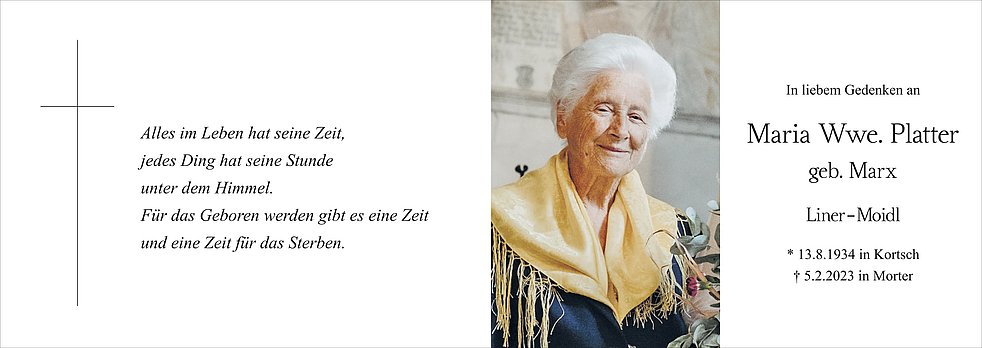 Am Mittwoch, 8. Februar, um 13.30 Uhr beten wir den Rosenkranz; um 14 Uhr feiern wir den Begräbnisgottesdienst in der Pfarrkirche von Morter.