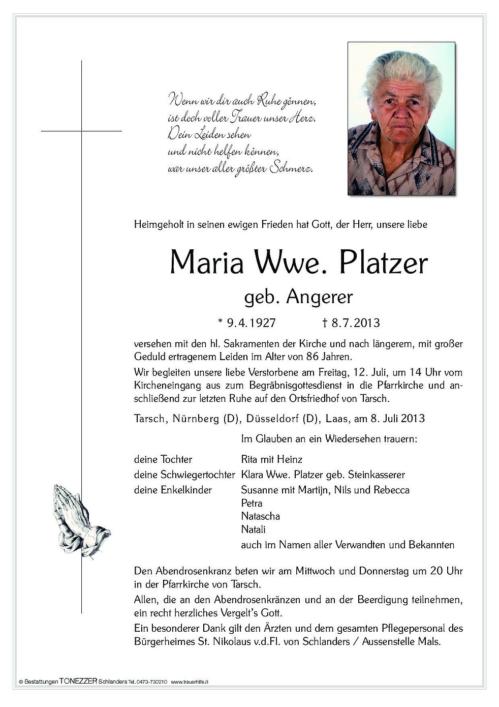 Wir begleiten unsere liebe Verstorbene am Freitag, 12. Juli, um 14 Uhr vom Kircheneingang aus zum Begräbnisgottesdienst in die Pfarrkirche und anschließend zur letzten Ruhe auf den Ortsfriedhof von Tarsch.