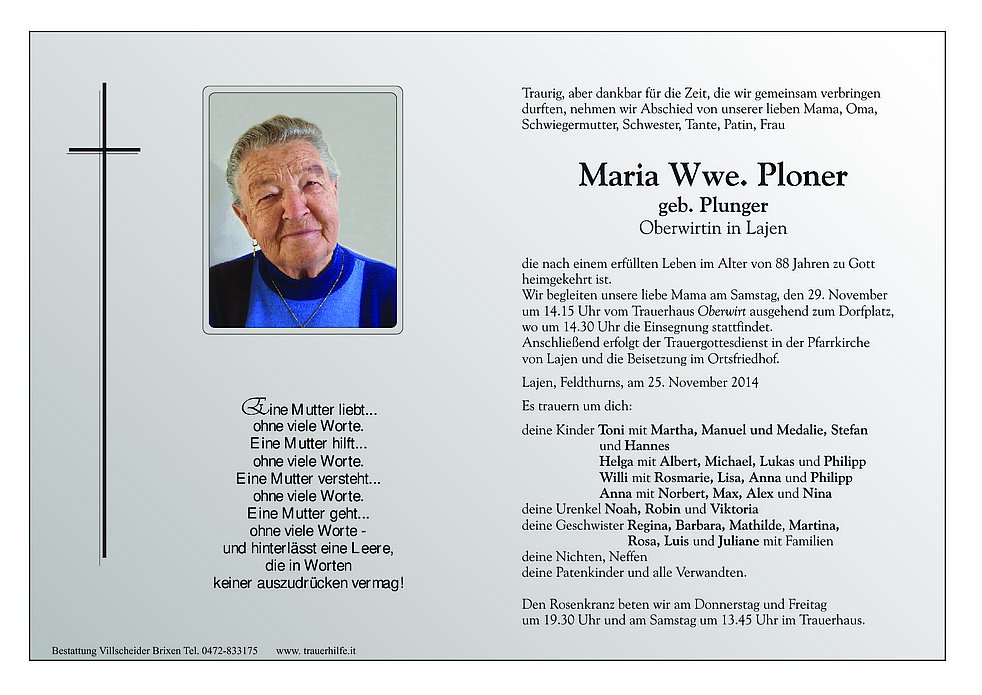 Wir begleiten unsere liebe Mama am Samstag, den 29. November um 14.15 Uhr vom Trauerhaus Oberwirt ausgehend zum Dorfplatz, wo um 14.30 Uhr die Einsegnung stattfindet.