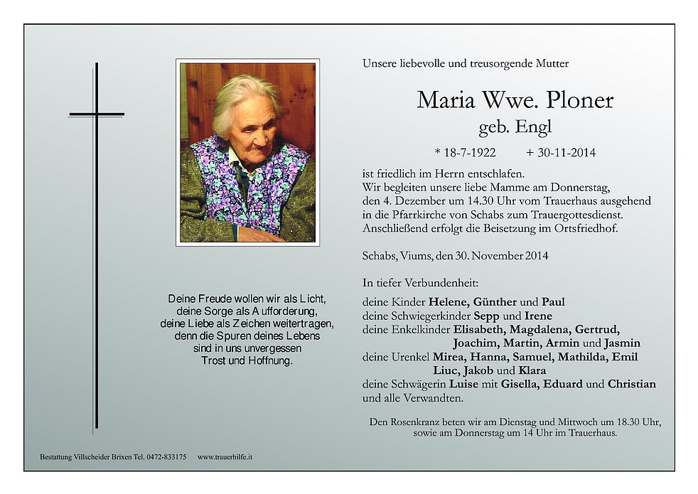in die Pfarrkirche von Schabs zum Trauergottesdienst. Anschließend erfolgt die Beisetzung im Ortsfriedhof.