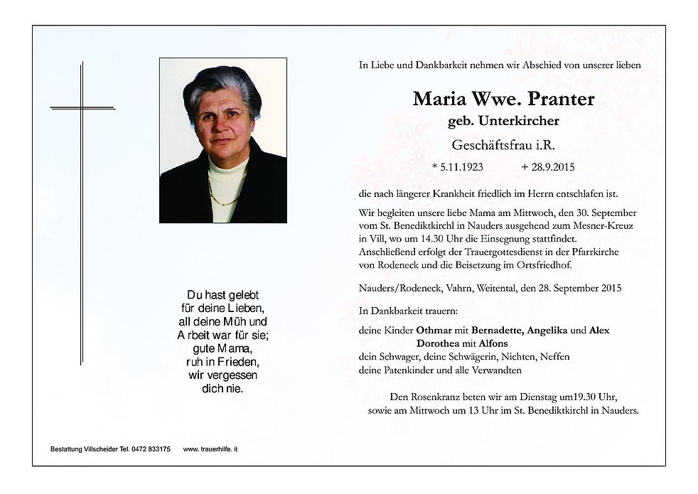 Wir begleiten unsere liebe Mama am Mittwoch, den 30. September vom St. Benediktkirchl in Nauders ausgehend zum Mesner-Kreuz