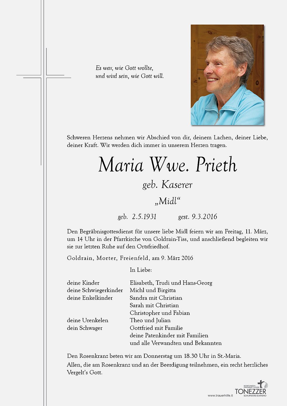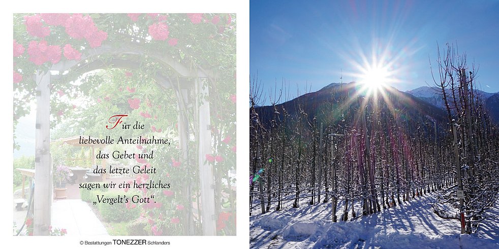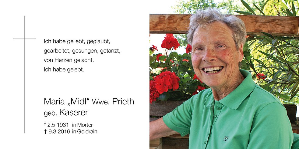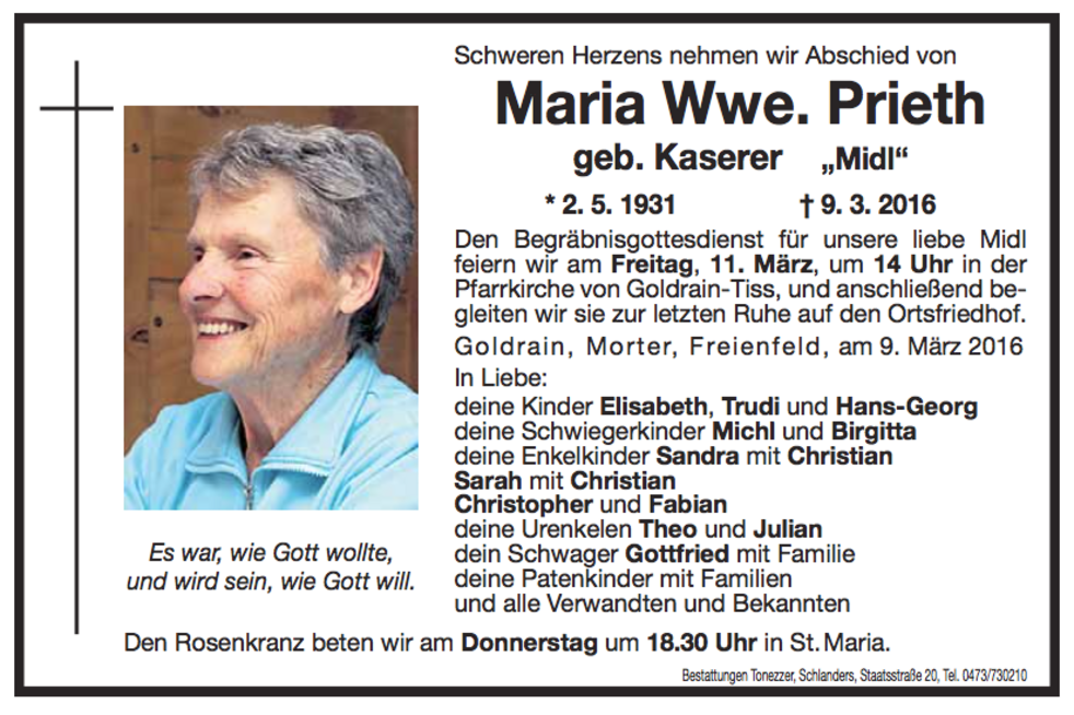 Den Begräbnisgottesdienst für unsere liebe Midl feiern wir am Freitag, 11. März, um 14 Uhr in der Pfarrkirche von Goldrain-Tiss, und anschließend begleiten wir sie zur letzten Ruhe auf den Ortsfriedhof.