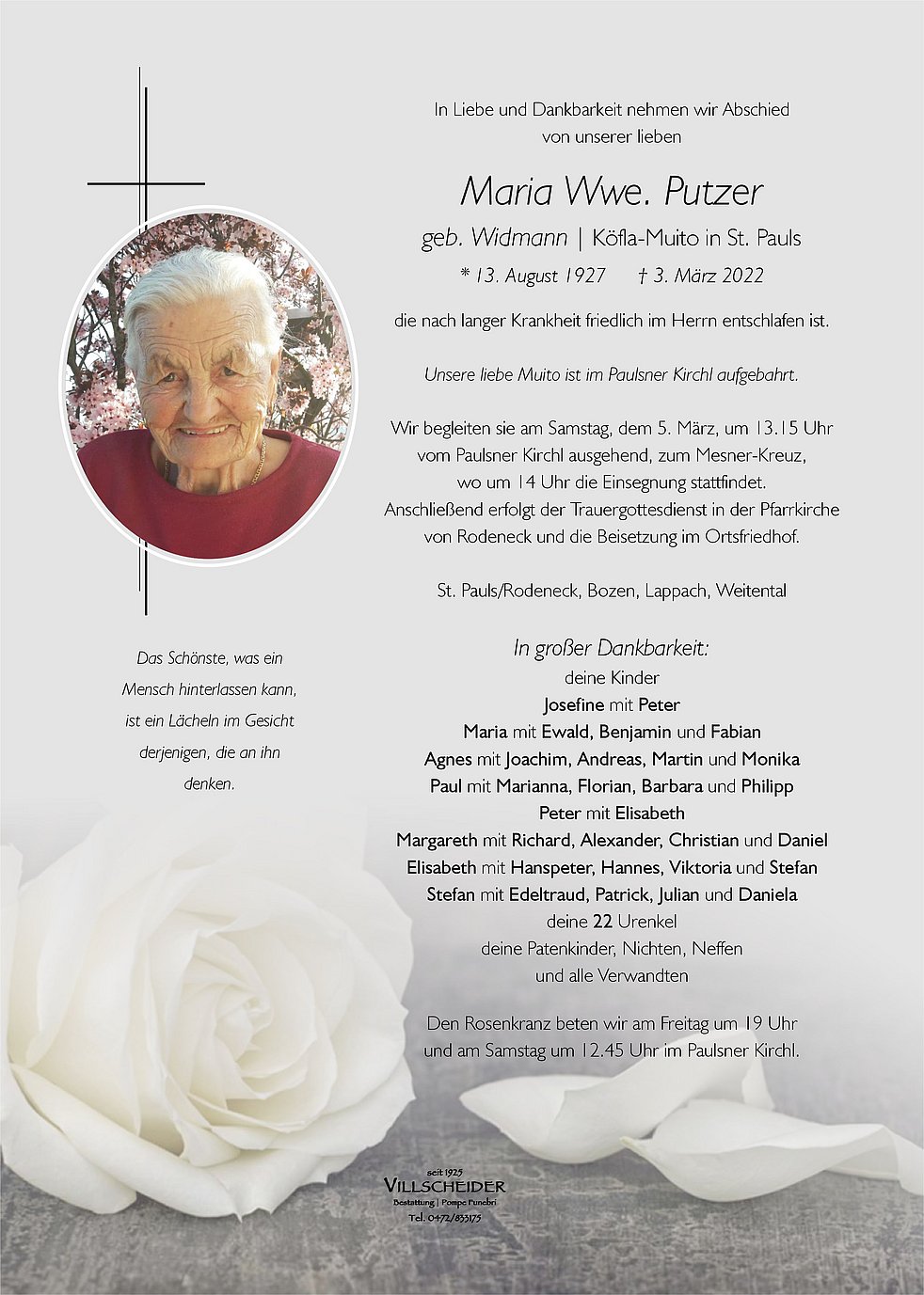 Begräbnisgottesdienst: 05.03. - 14:00 Uhr Rodeneck
