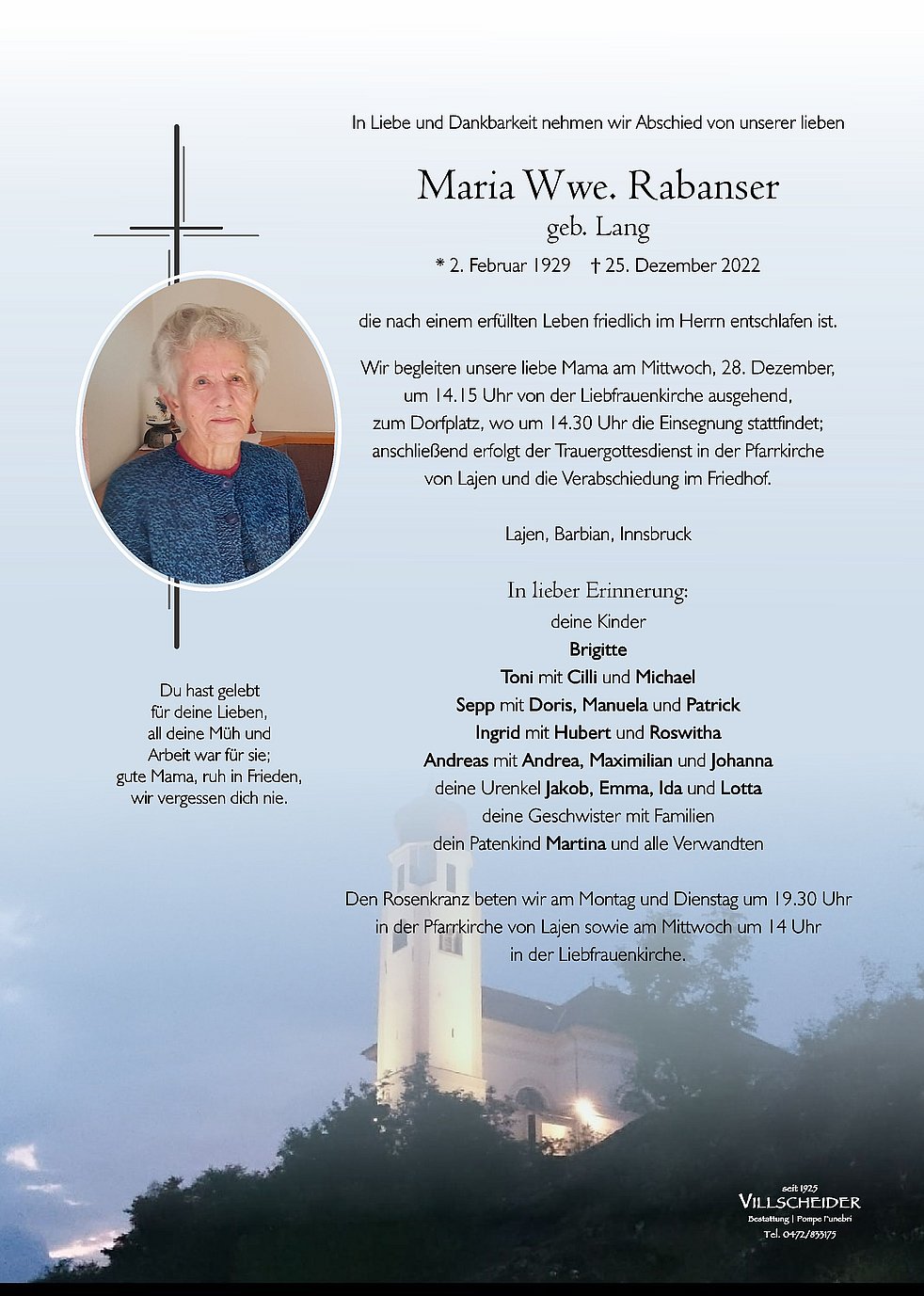 Begräbnisgottesdienst: 28.12. - 14:30 Uhr Lajen