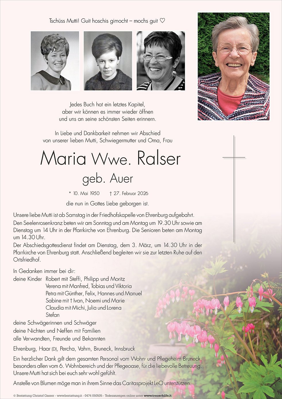 Anstelle von Blumen möge man in ihrem Sinne das Caritasprojekt LeO unterstützen.