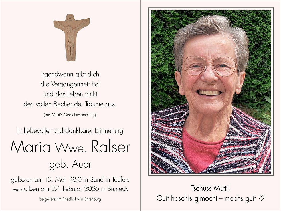 Ein herzlicher Dank gilt dem gesamten Personal vom Wohn- und Pflegeheim Bruneck, besonders allen vom 6. Wohnbereich und der Pflegeoase, für die liebevolle Betreuung. Unsere Mutti hat sich bei euch sehr wohl gefühlt.