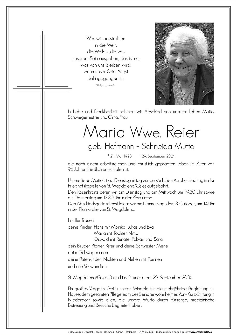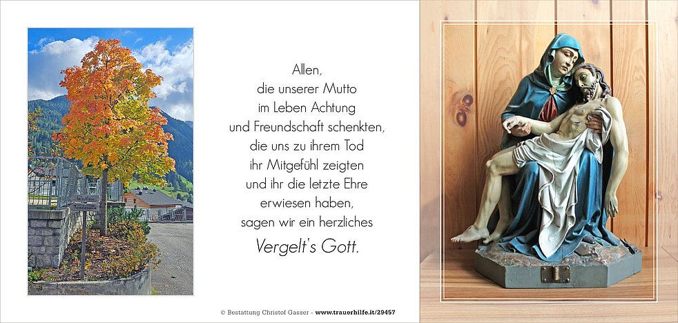 Ein großes Vergelt’s Gott unserer Mihaela für die mehrjährige Begleitung zu Hause, dem gesamten Pflegeteam des Seniorenwohnheimes Von- Kurz-Stiftung in Niederdorf sowie allen, die unsere Mutto durch Fürsorge, medizinische Betreuung und Besuche begleitet haben.