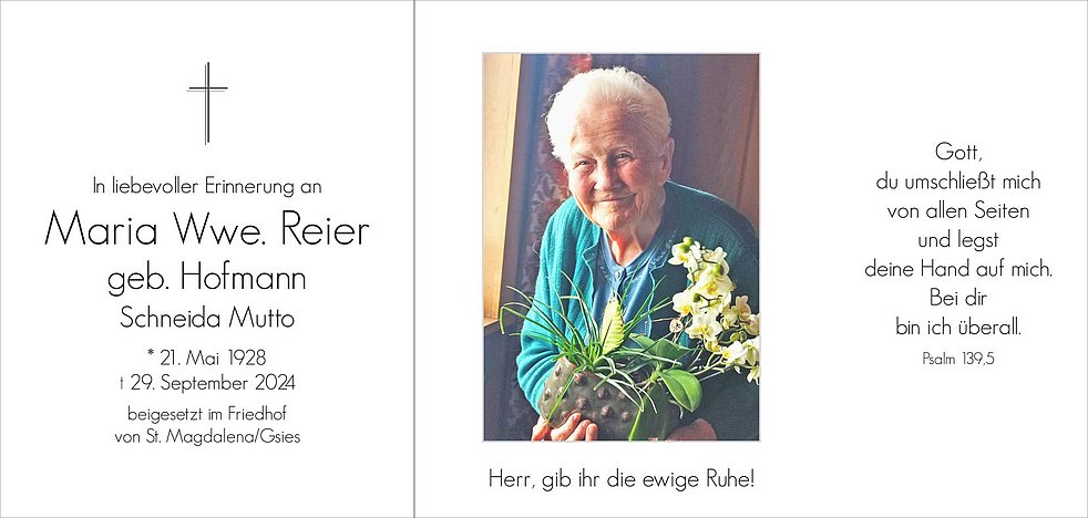 Unsere liebe Mutto ist ab Dienstagmittag zur persönlichen Verabschiedung in der Friedhofskapelle von St. Magdalena/Gsies aufgebahrt.