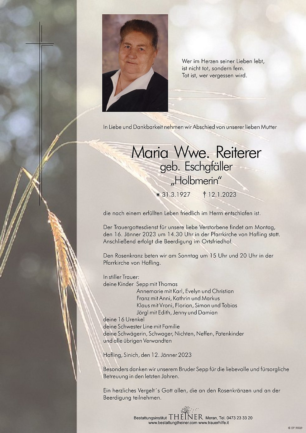 den 16. Jänner 2023 um 14.30 Uhr in der Pfarrkirche von Hafling statt. Anschließend erfolgt die Beerdigung im Ortsfriedhof.