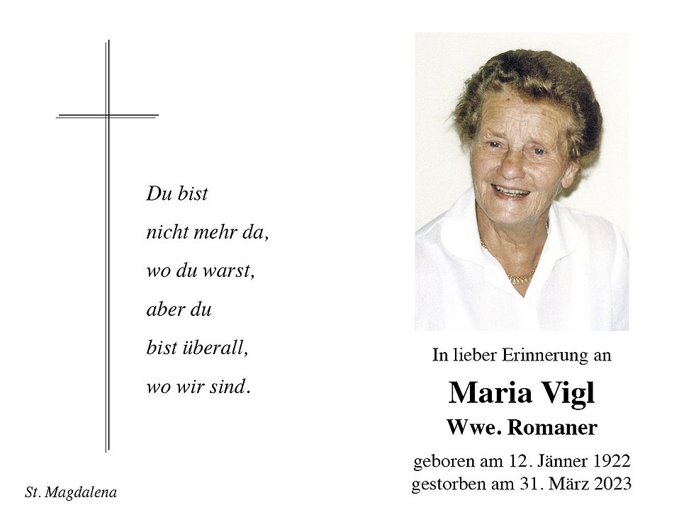 Dankbar für die lange Zeit, die wir gemeinsam erleben durften, nehmen wir Abschied von unserer lieben Mama, Oma, Uroma und Tante