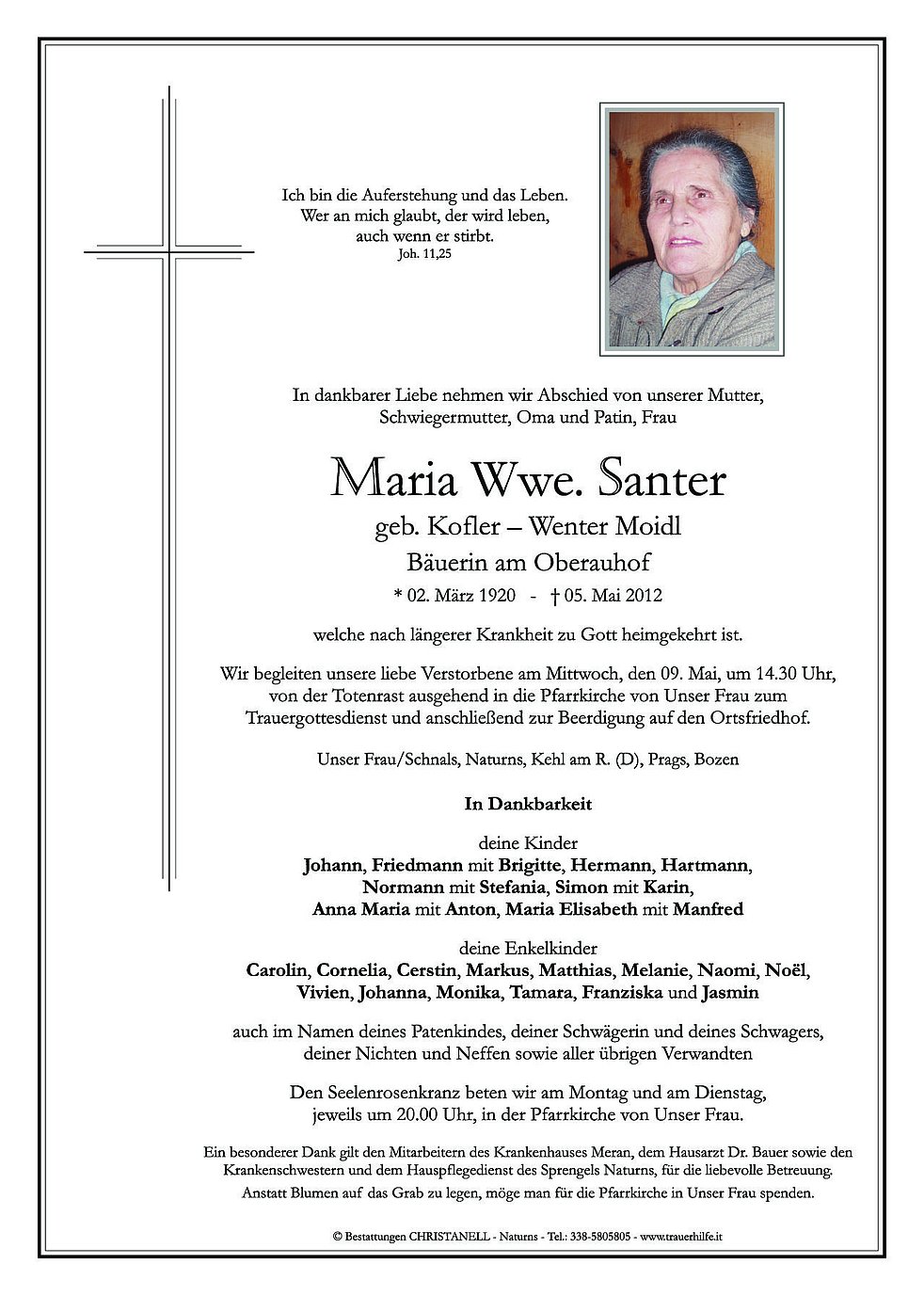Wir begleiten unsere liebe Verstorbene am Mittwoch, den 09. Mai, um 14.30 Uhr, von der Totenrast ausgehend in die Pfarrkirche von Unser Frau zum Trauergottesdienst und anschließend zur Beerdigung auf den Ortsfriedhof.