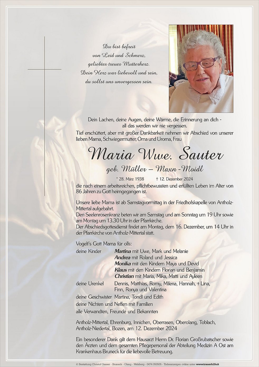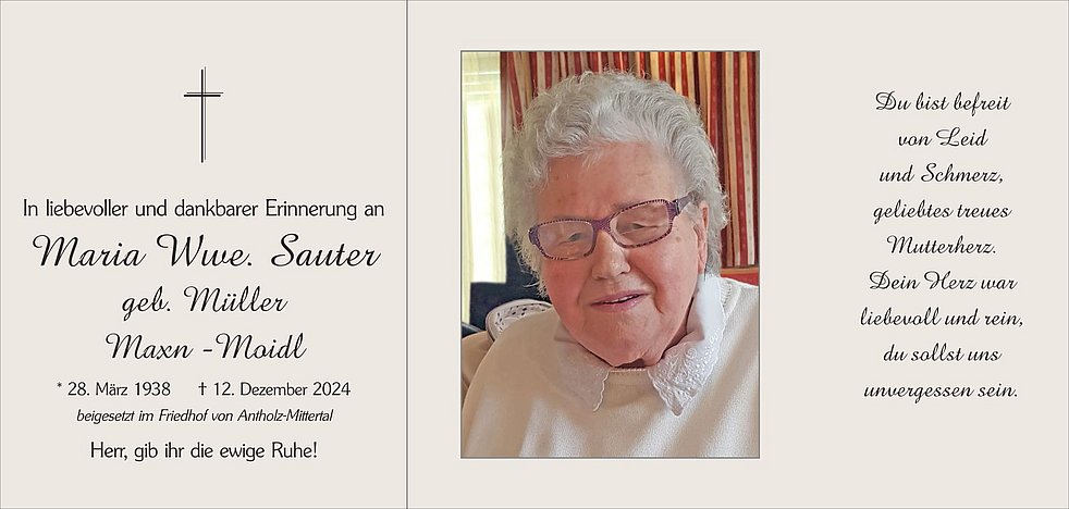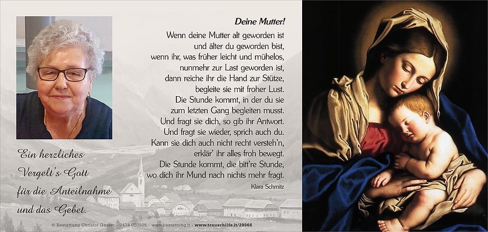 Unsere liebe Mama ist ab Samstagvormittag in der Friedhofskapelle von Antholz-Mittertal aufgebahrt.