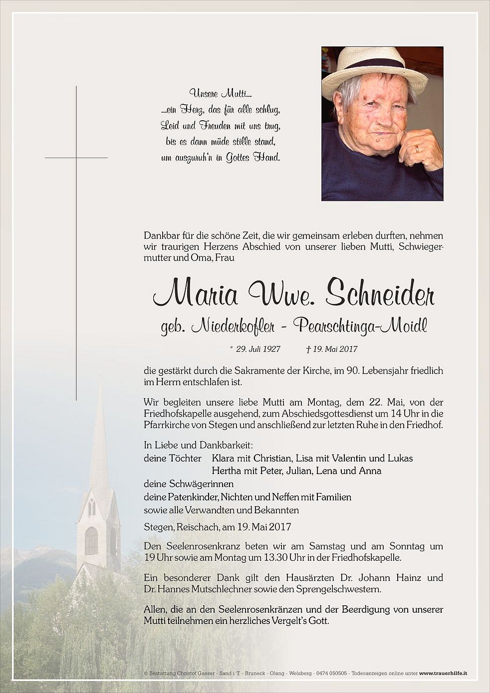 Wir begleiten unsere liebe Mutti am Montag, dem 22. Mai, von der Friedhofskapelle ausgehend, zum Abschiedsgottesdienst um 14 Uhr in die Pfarrkirche von Stegen und anschließend zur letzten Ruhe in den Friedhof.