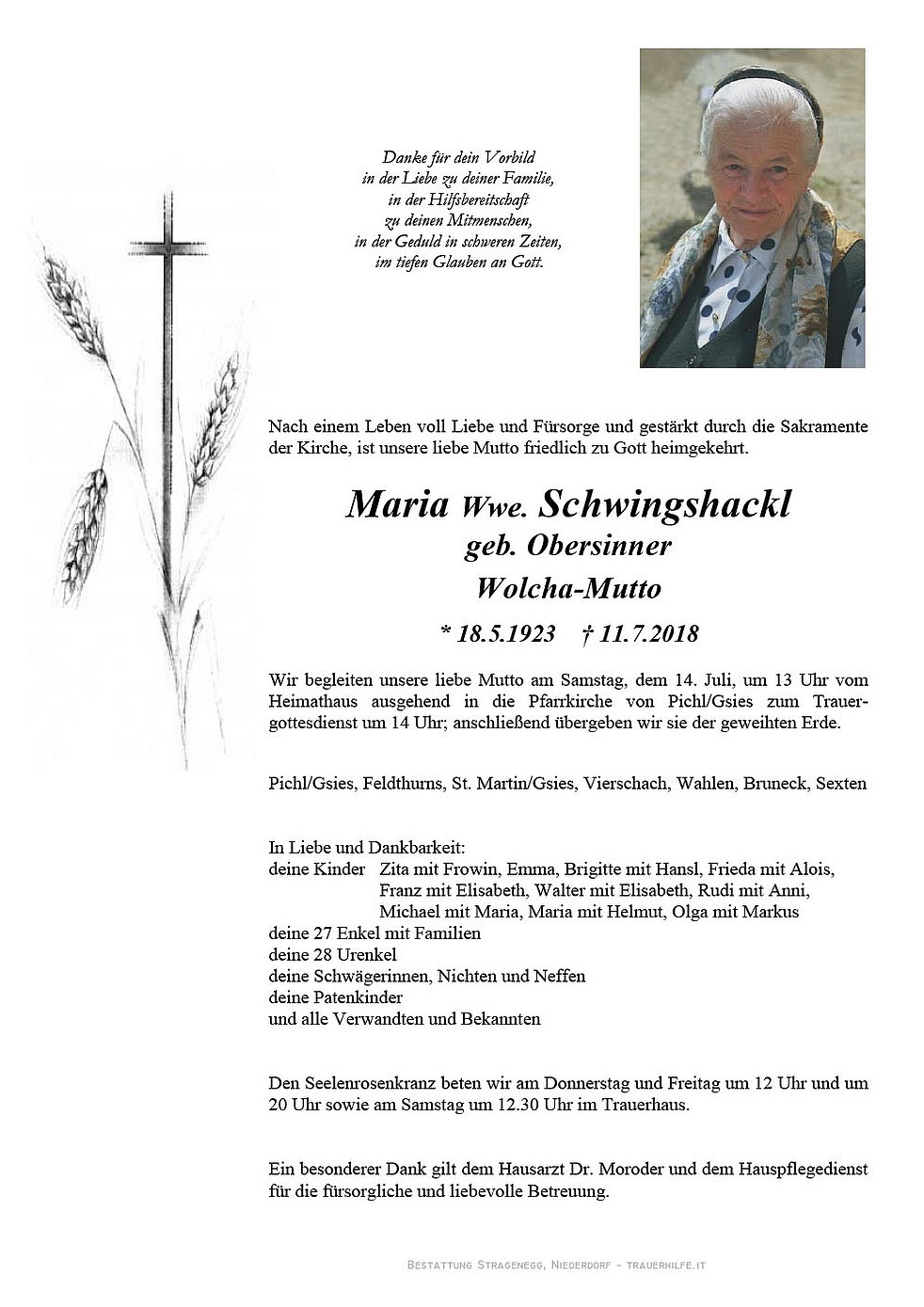 Wir begleiten unsere liebe Mutto am Samstag, dem 14. Juli, um 13 Uhr vom Heimathaus ausgehend in die Pfarrkirche von Pichl/Gsies zum Trauer- gottesdienst um 14 Uhr; anschließend übergeben wir sie der geweihten Erde.