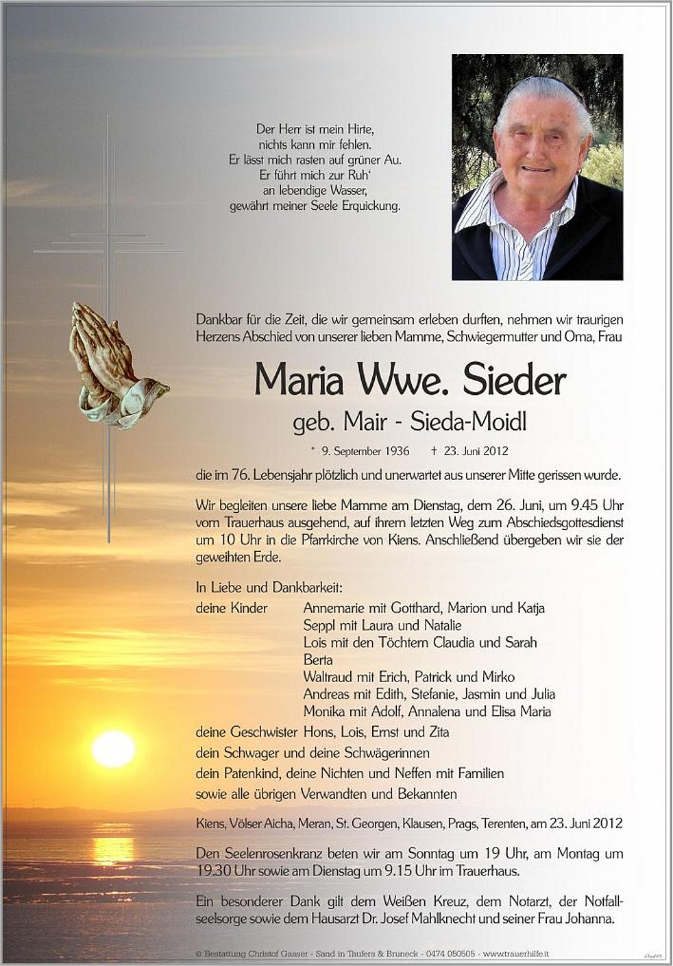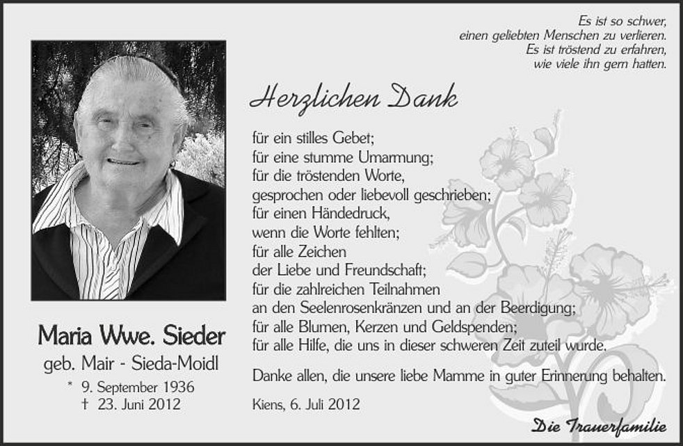 Wir begleiten unsere liebe Mamme am Dienstag, dem 26. Juni, um 9.45 Uhr vom Trauerhaus ausgehend, auf ihrem letzten Weg zum Abschiedsgottesdienst um 10 Uhr in die Pfarrkirche von Kiens. Anschließend übergeben wir sie der geweihten Erde.