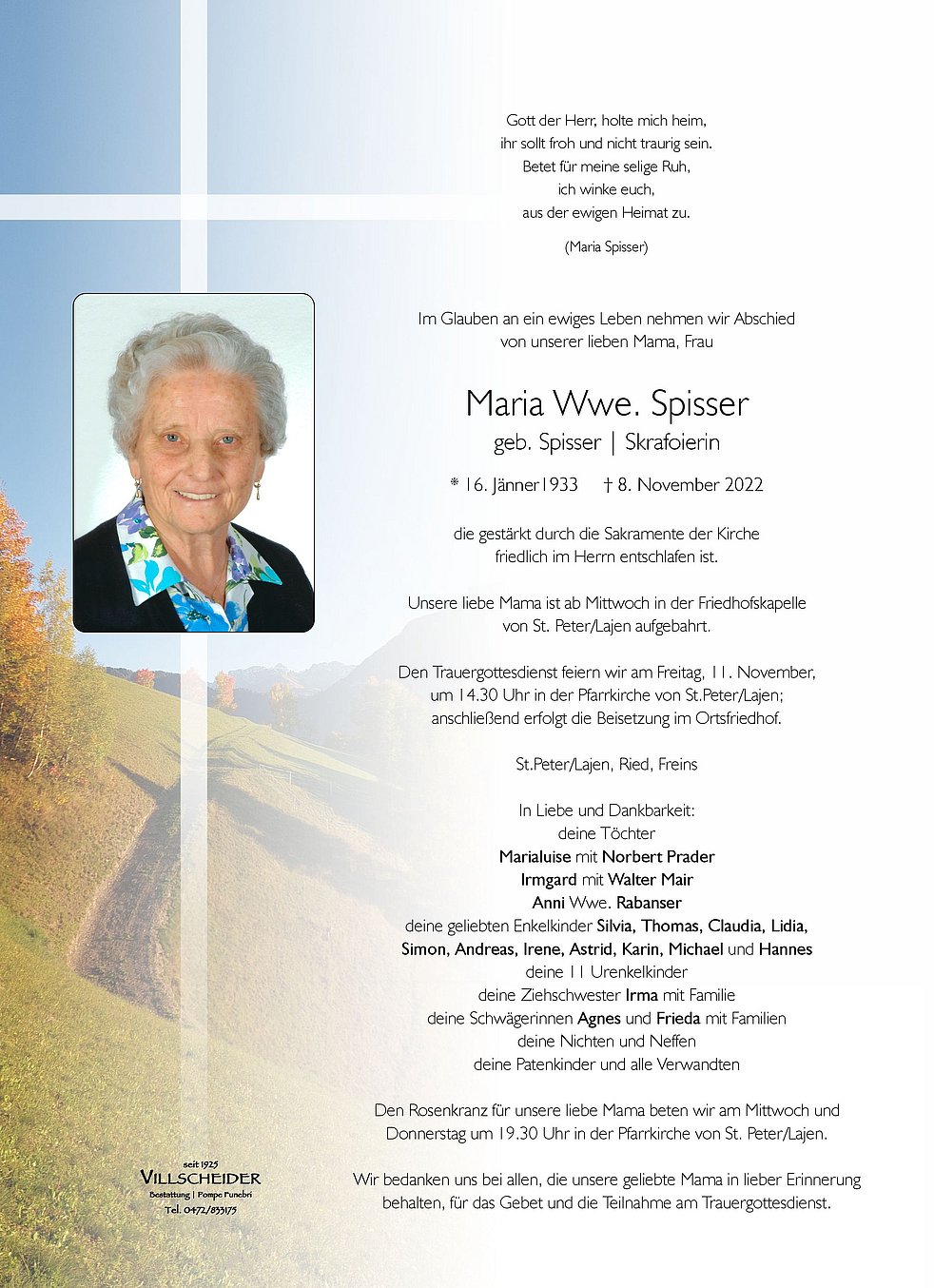 Marialuise, mein aufrichtiges Beileid am Tod deiner lieben Mutter von einer ehemahligen Mitschülerin an der Mittelschule in Bozen.