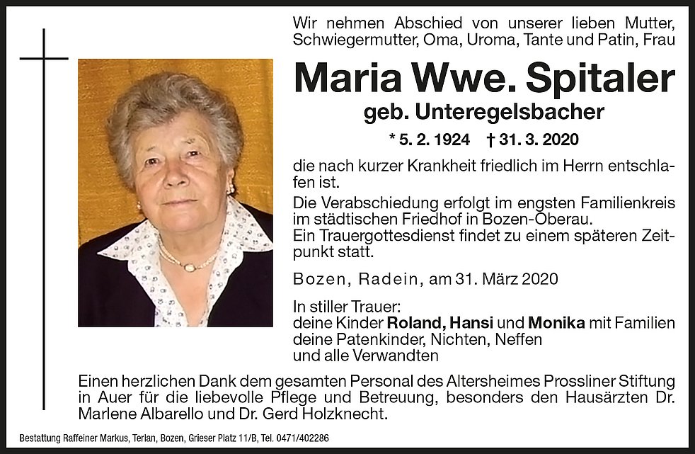 Die Verabschiedung erfolgt im engsten Familienkreis am städtischen Friedhof in Bozen/Oberau.