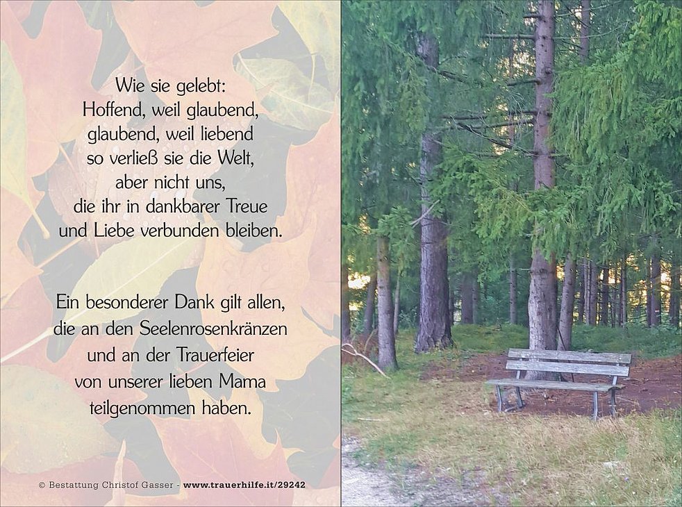 Ein besonderer Dank gilt allen, die an den Seelenrosenkränzen und an der Trauerfeier von unserer lieben Mama teilnehmen.