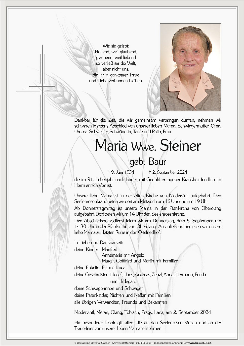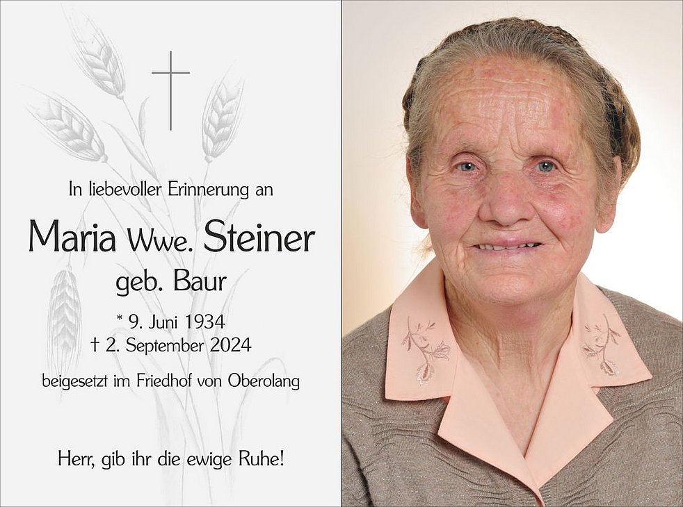 Den Abschiedsgottesdienst feiern wir am Donnerstag, dem 5. September, um 14.30 Uhr in der Pfarrkirche von Oberolang. Anschließend begleiten wir unsere liebe Mama zur letzten Ruhe in den Ortsfriedhof.