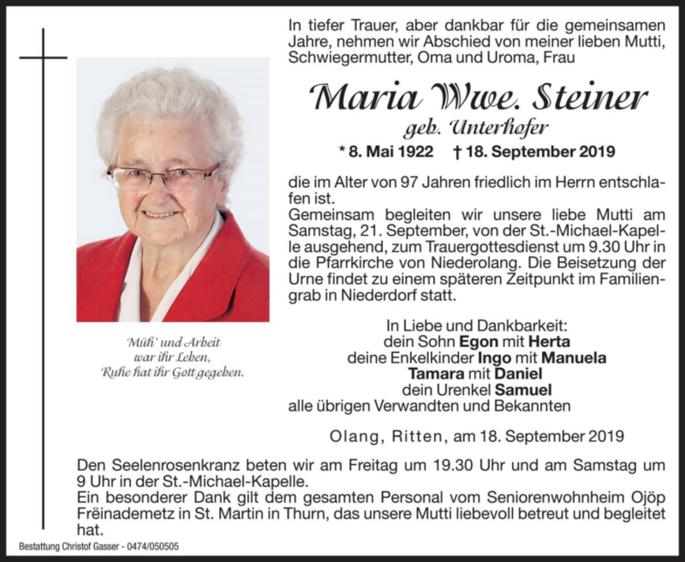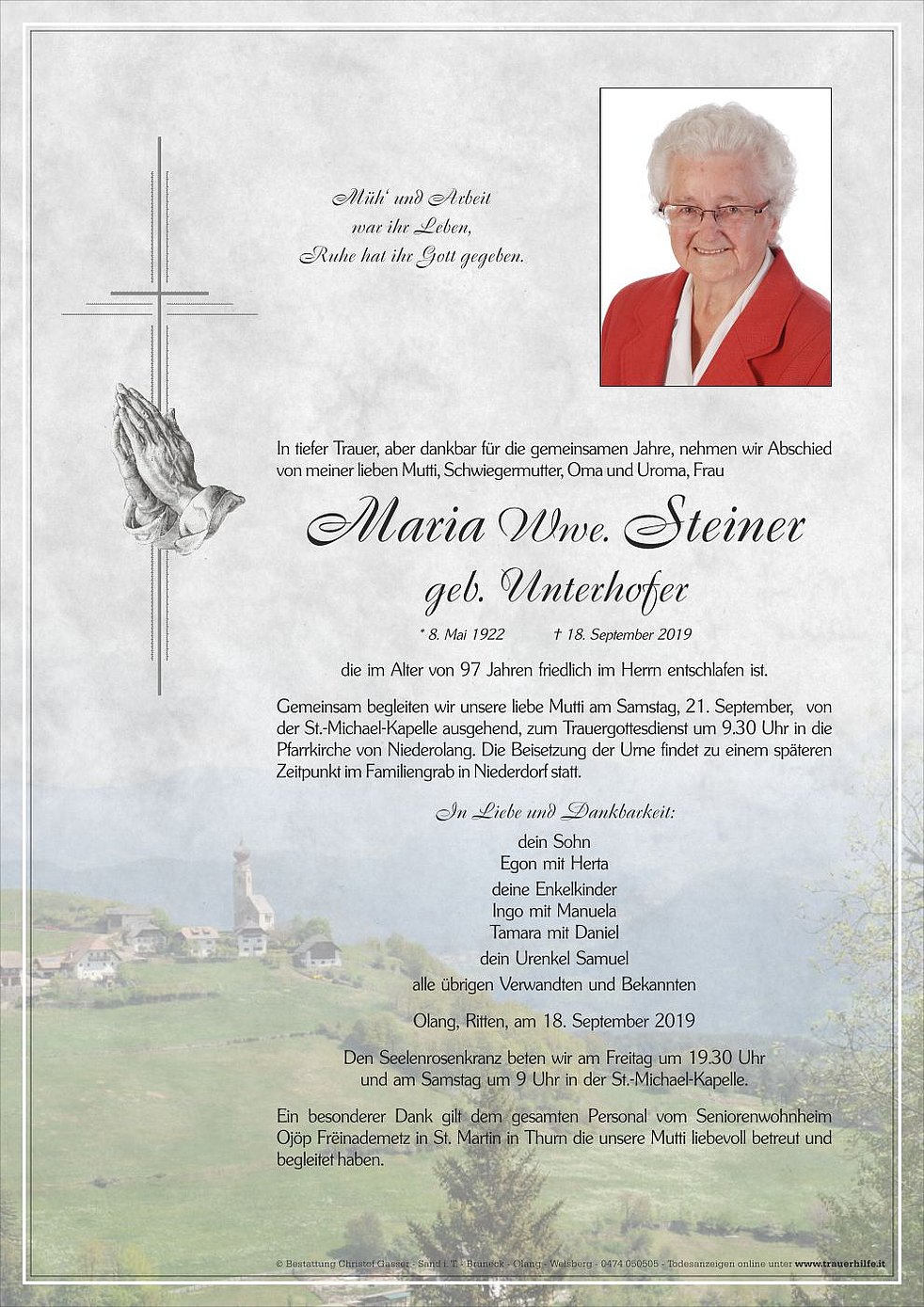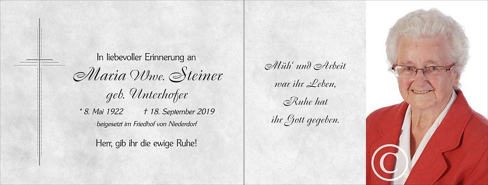 Gemeinsam begleiten wir unsere liebe Mutti am Samstag, 21. September, von der St.-Michael-Kapelle ausgehend, zum Trauergottesdienst um 9.30 Uhr in die Pfarrkirche von Niederolang. Die Beisetzung der Urne findet zu einem späteren Zeitpunkt im Familiengrab in Niederdorf statt.