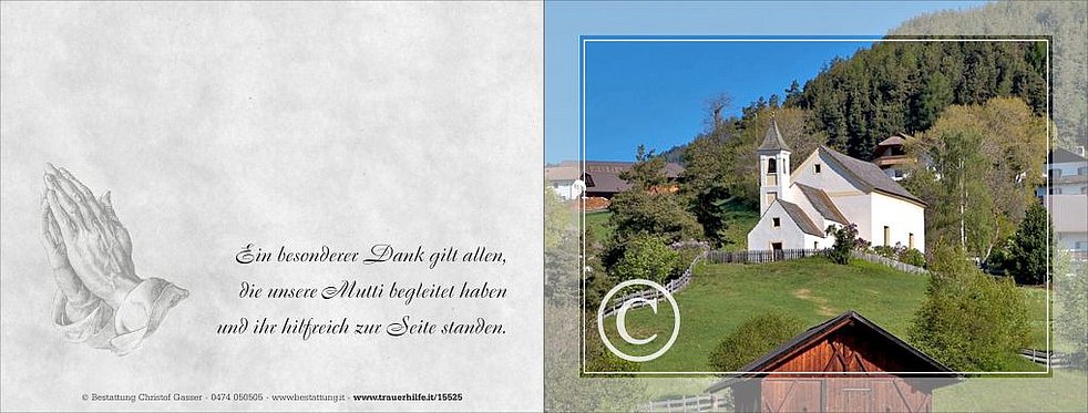 Ein besonderer Dank gilt dem gesamten Personal vom SeniorenwohnheimOjöp Frëinademetz in St. Martin in Thurn die unsere Mutti liebevoll betreut und begleitet haben.