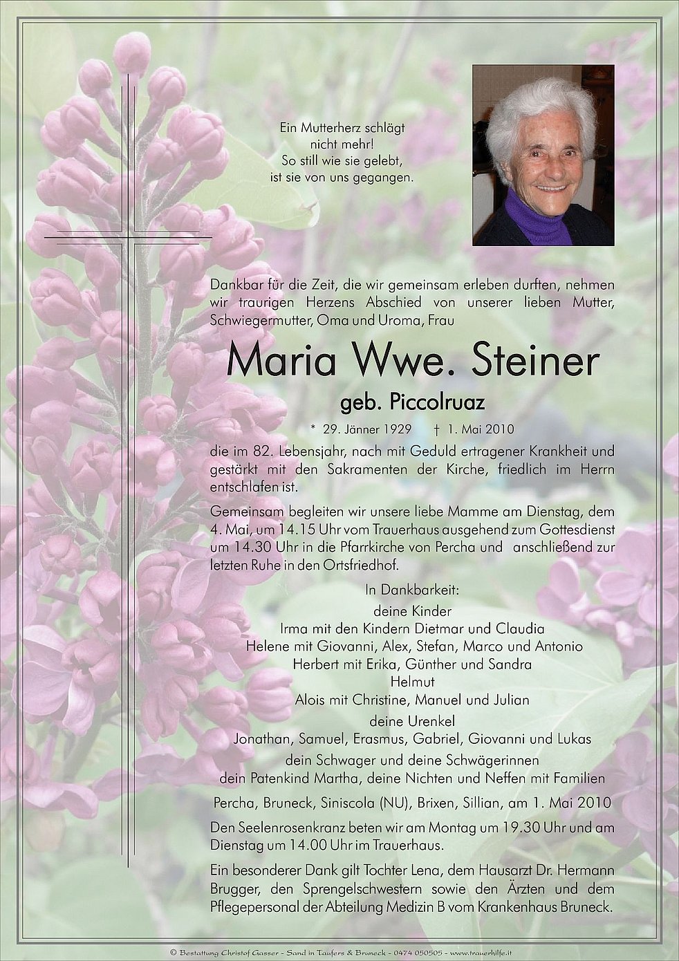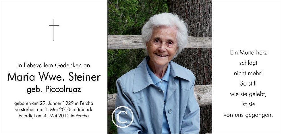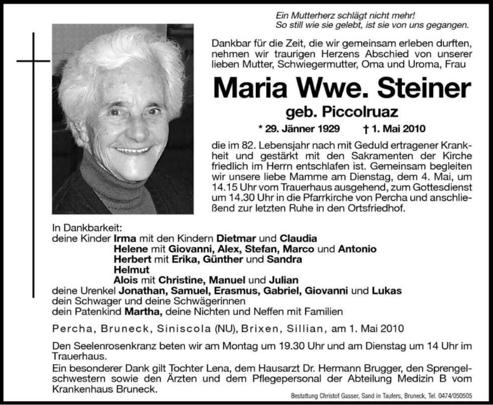Gemeinsam begleiten wir unsere liebe Mamme am Dienstag, dem 4. Mai, um 14.15 Uhr vom Trauerhaus ausgehend zum Gottesdienst um 14.30 Uhr in die Pfarrkirche von Percha und anschließend zur letzten Ruhe in den Ortsfriedhof.