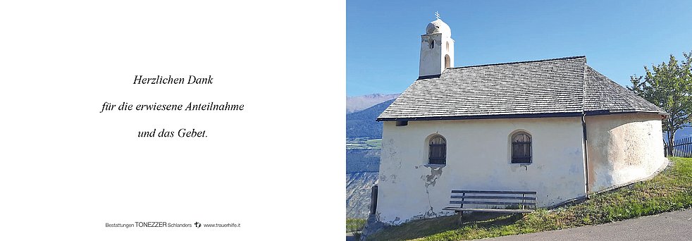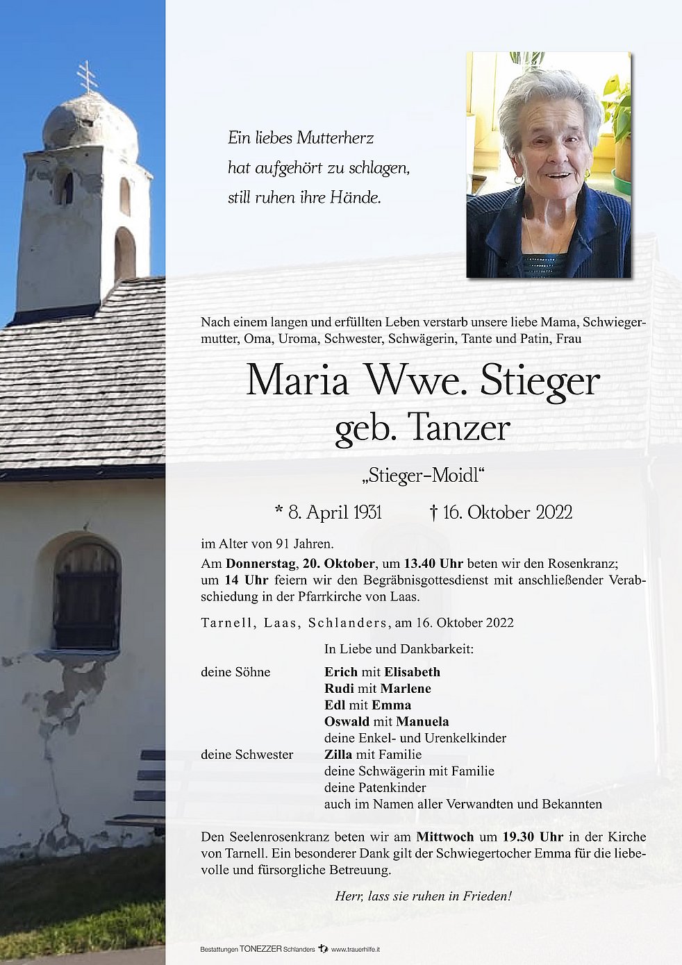 Am Donnerstag, 20. Oktober, um 13.40 Uhr beten wir den Rosenkranz; um 14 Uhr feiern wir den Begräbnisgottesdienst mit anschließender Verabschiedung in der Pfarrkirche von Laas.