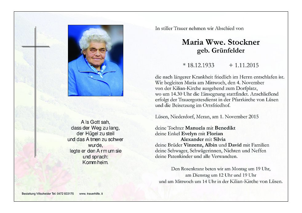 wo um 14.30 Uhr die Einsegnung stattfindet. Anschließend erfolgt der Trauergottesdienst in der Pfarrkirche von Lüsen und die Beisetzung im Ortsfriedhof.