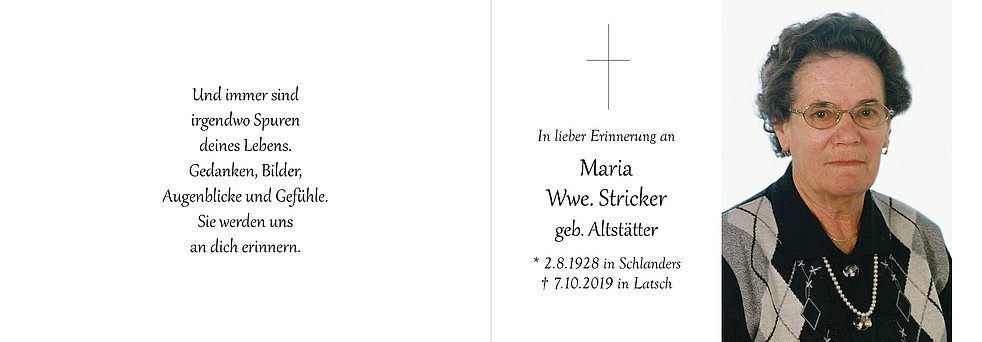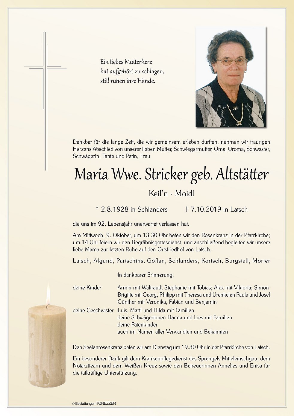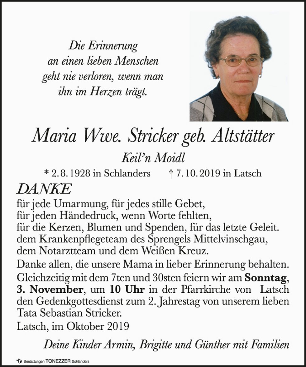 Am Mittwoch, 9. Oktober, um 13.30 Uhr beten wir den Rosenkranz in der Pfarrkirche; um 14 Uhr feiern wir den Begräbnisgottesdienst, und anschließend begleiten wir unsere liebe Mama zur letzten Ruhe auf den Ortsfriedhof von Latsch.