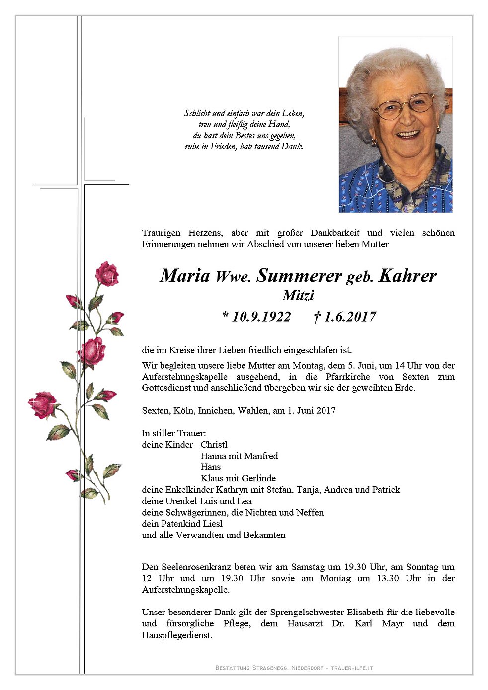 Unser besonderer Dank gilt der Sprengelschwester Elisabeth für die liebevolle und fürsorgliche Pflege, dem Hausarzt Dr. Karl Mayr und dem Hauspflegedienst.