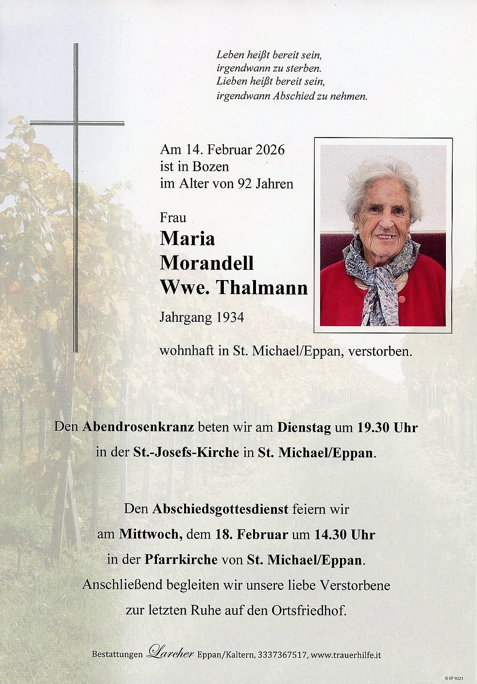 Den Abschiedsgottesdienst feiern wir am Mittwoch, dem 18. Februar, um 14.30 Uhr in der Pfarrkirche von St. Michael/Eppan. Anschließend begleiten wir unsere liebe Verstorbene zur letzten Ruhe auf den Ortsfriedhof.