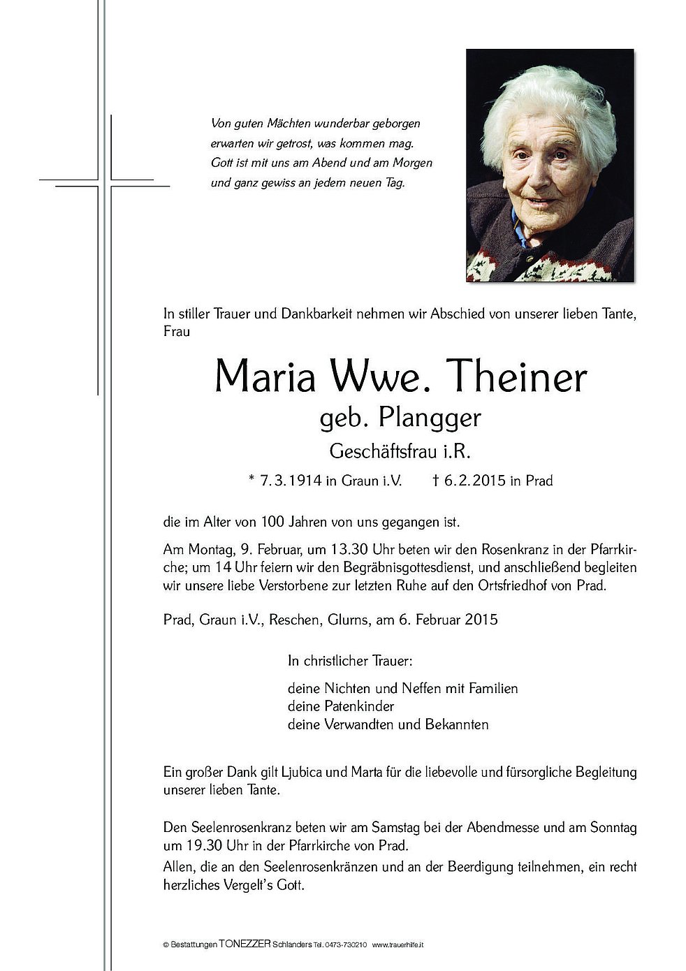 * 7.3.1914 in Graun i.V. † 6.2.2015 in Prad