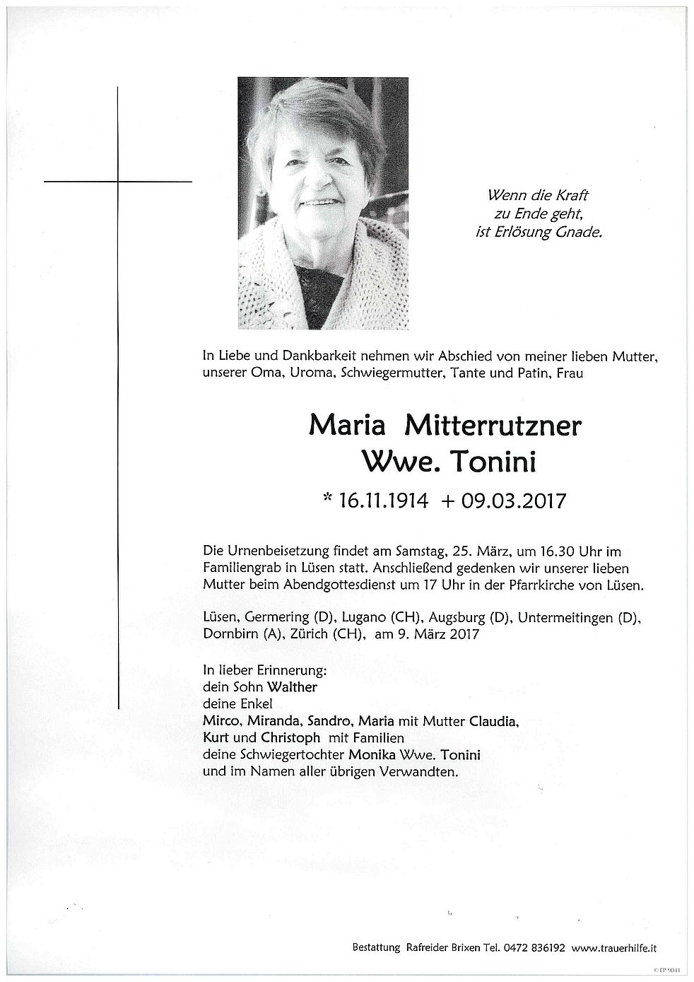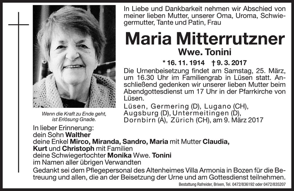 Die Urnenbeisetzung findet am Samstag, 25. März, um 16.30 Uhr im Familiengrab in Lüsen statt. Anschließend gedenken wir unserer lieben Mutter beim Abendgottesdienst um 17 Uhr in der Pfarrkirche von Lüsen.