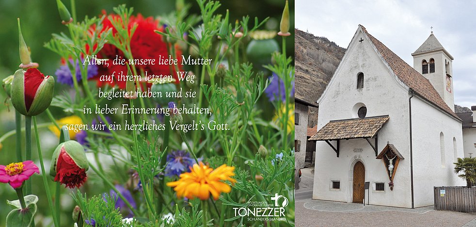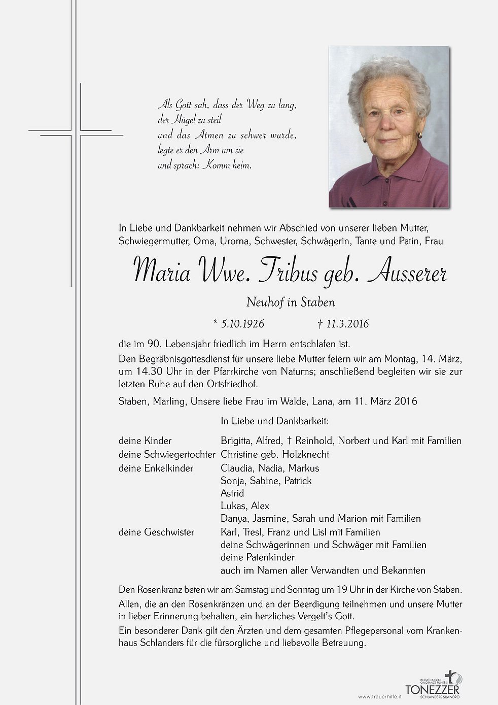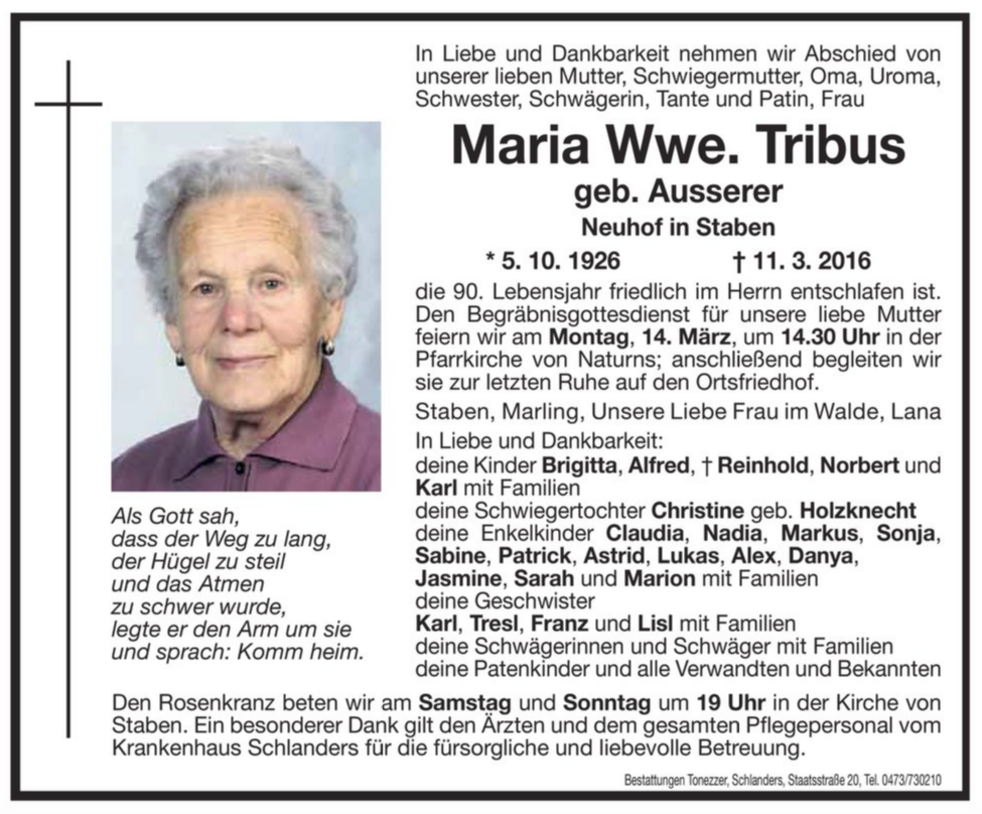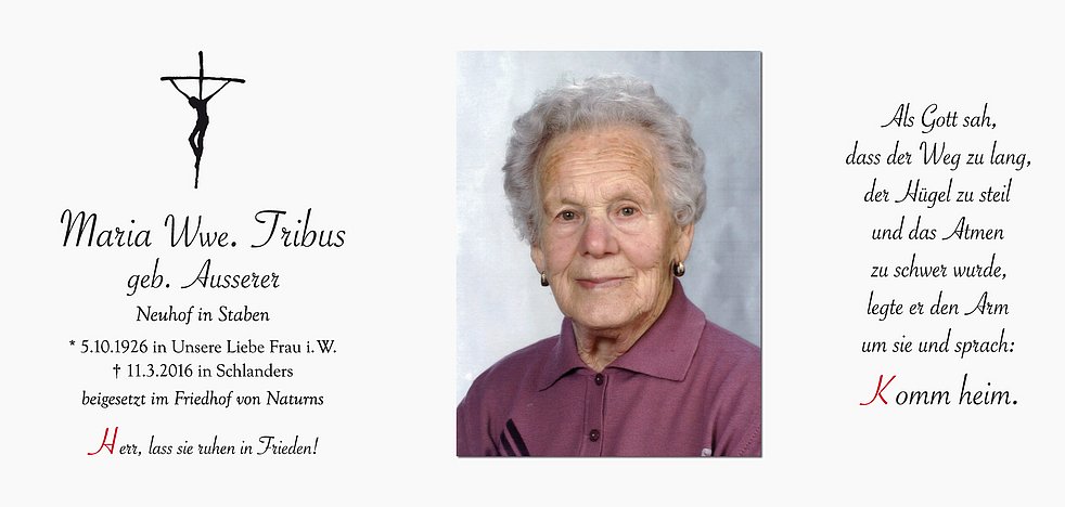 Den Begräbnisgottesdienst für unsere liebe Mutter feiern wir am Montag, 14. März, um 14.30 Uhr in der Pfarrkirche von Naturns; anschließend begleiten wir sie zur letzten Ruhe auf den Ortsfriedhof.