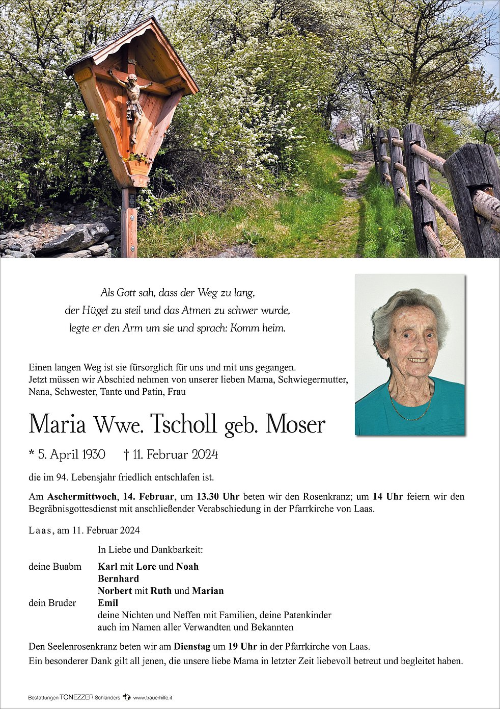 Am Aschermittwoch, 14. Februar, um 13.30 Uhr beten wir den Rosenkranz; um 14 Uhr feiern wir den Begräbnisgottesdienst mit anschließender Verabschiedung in der Pfarrkirche von Laas.
