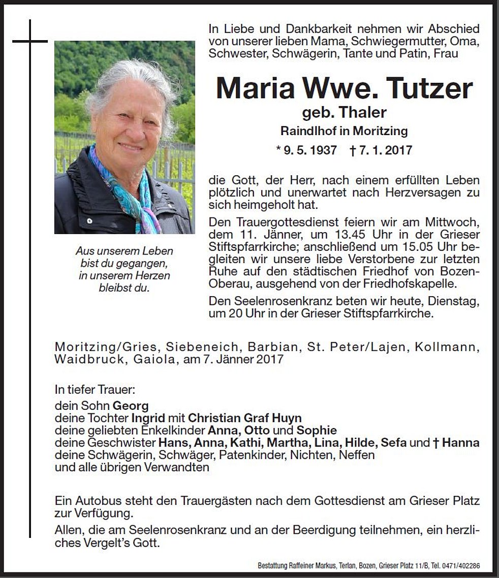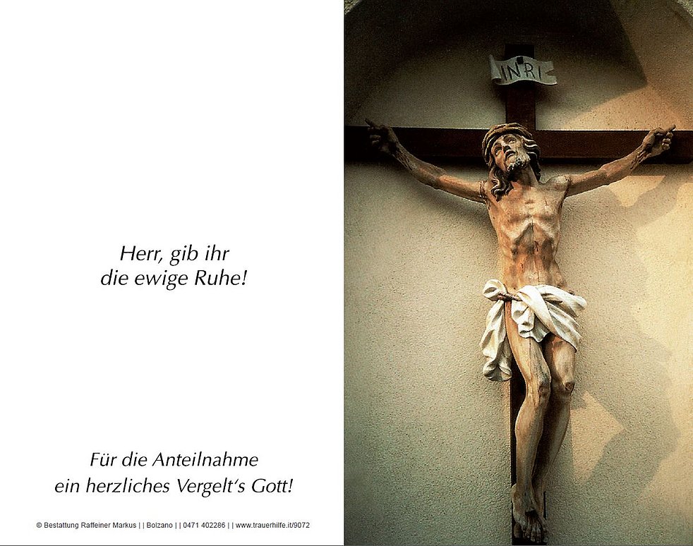 Den Trauergottesdienst feiern wir am Mittwoch, den 11. Jänner, um 13.45 Uhr in der Grieser Stiftspfarrkirche; anschlieβend um 15.05 Uhr begleiten wir unsere liebe Verstorbene zur letzten Ruhe auf den städtischen Friedhof von Bozen-Oberau, ausgehend von der Friedhofskapelle.