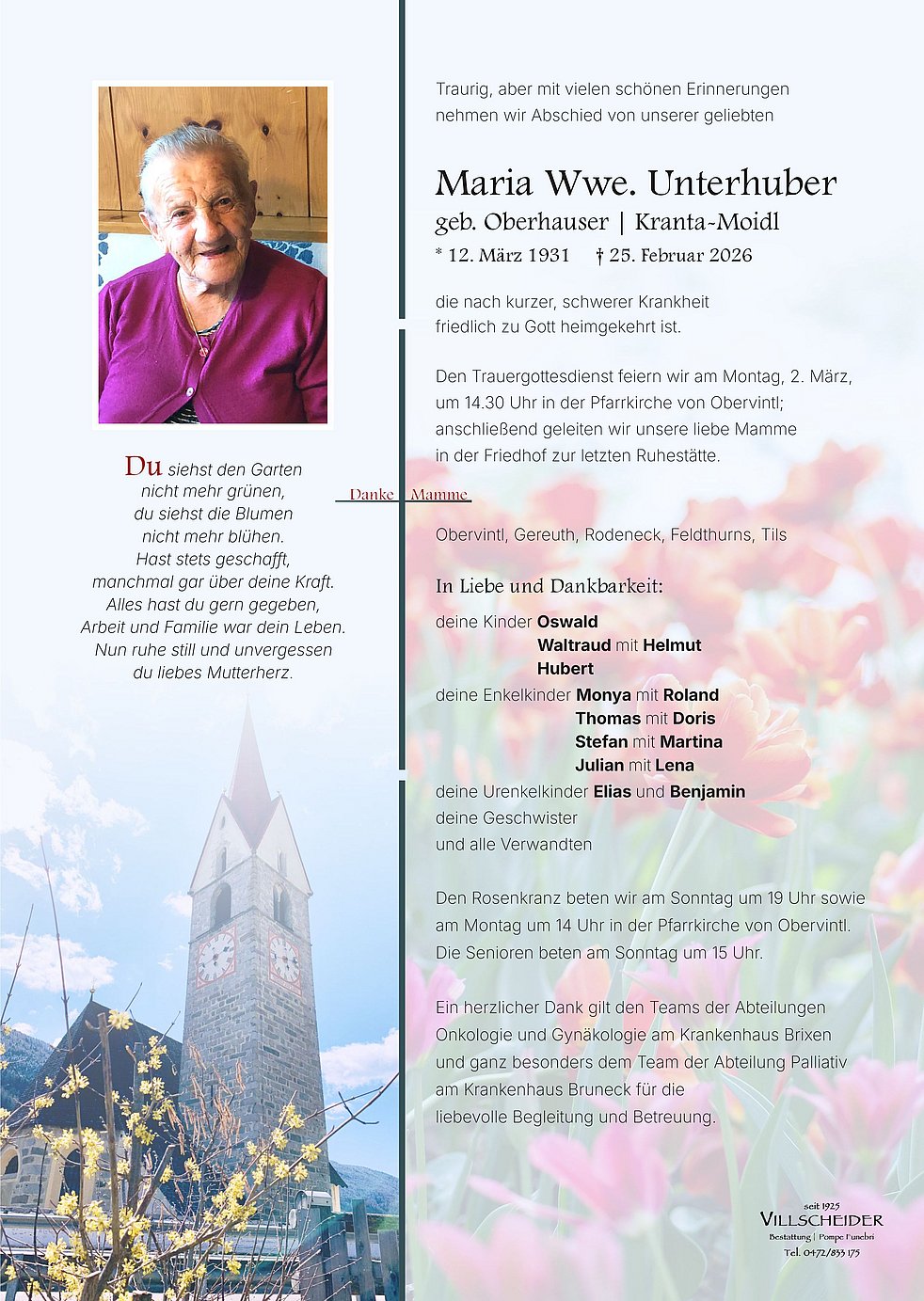 Begräbnisgottesdienst: 02.03. - 14:30 Uhr Obervintl