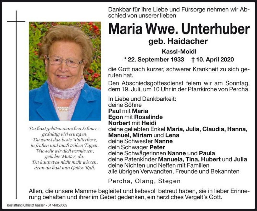 Allen, die unsere Mamme begleitet und liebevoll betreut haben, sie in lieber Erinnerung bahalten und ihrer im Gebet gedenken, ein herzliches Vergelt’s Gott.