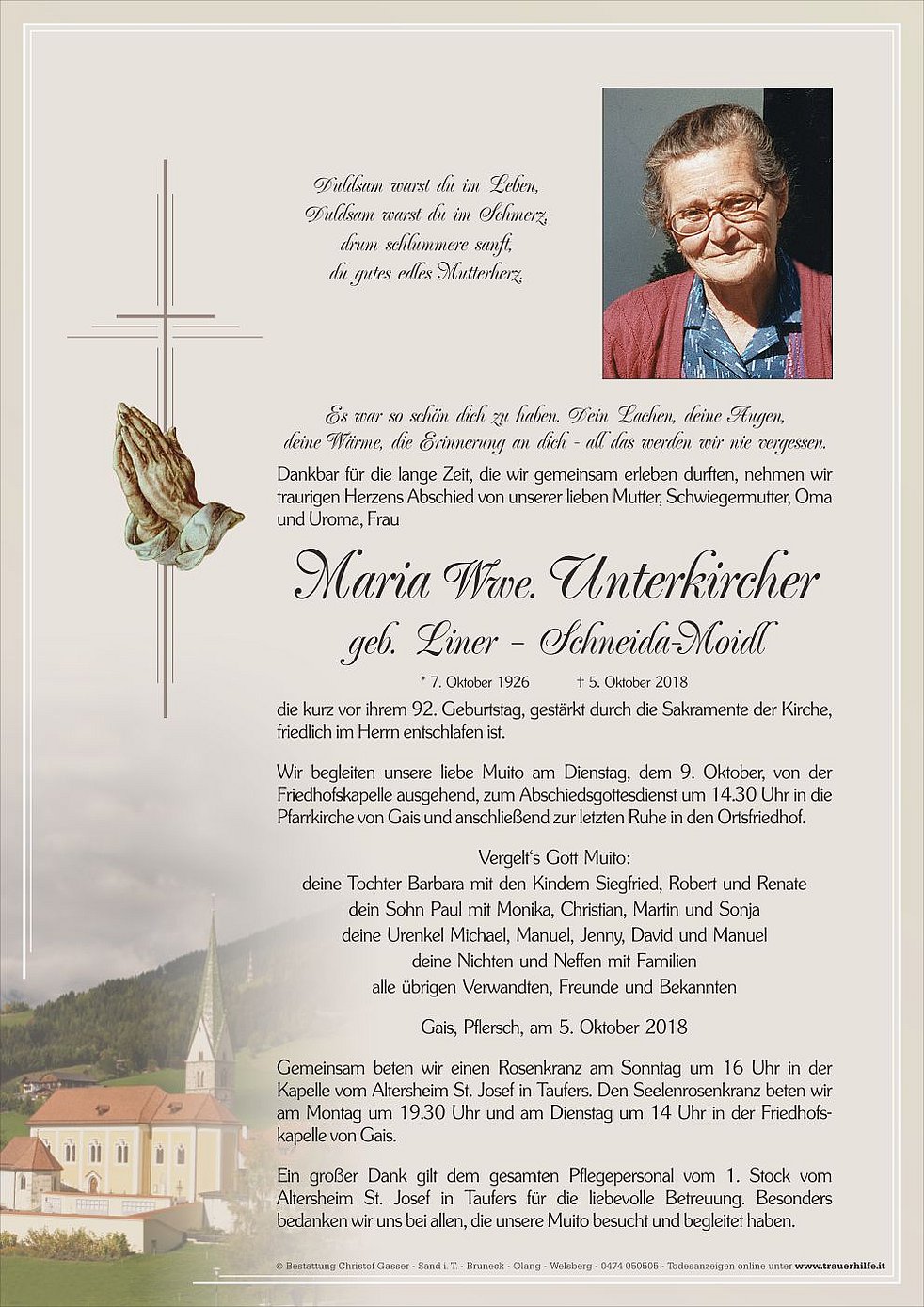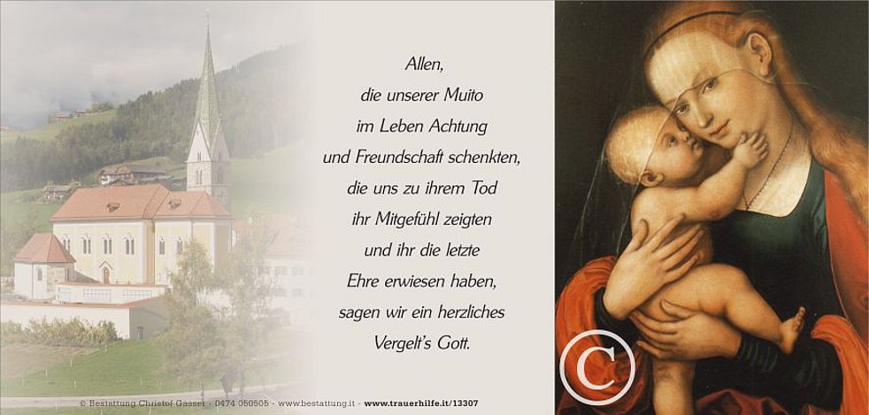 Wir begleiten unsere liebe Muito am Dienstag, dem 9. Oktober, von der Friedhofskapelle ausgehend, zum Abschiedsgottesdienst um 14.30 Uhr in die Pfarrkirche von Gais und anschließend zur letzten Ruhe in den Ortsfriedhof.