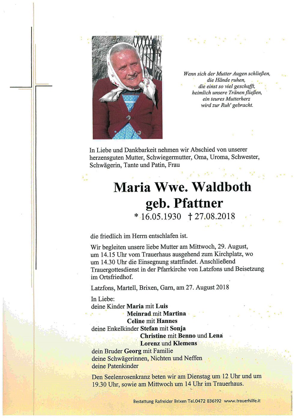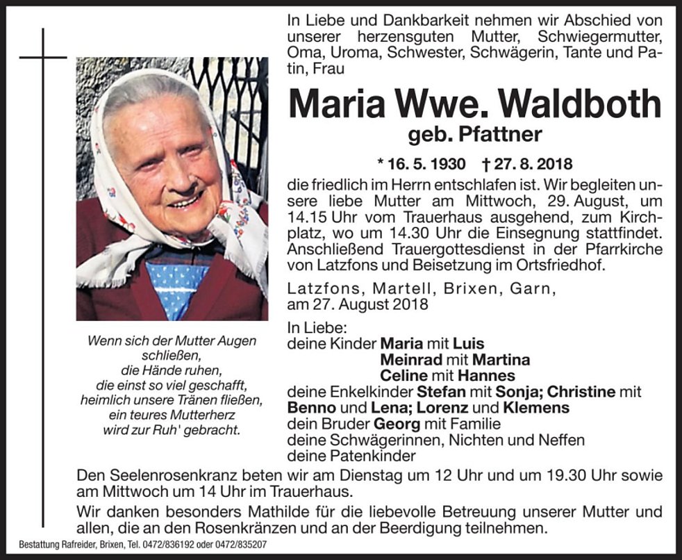 Wir begleiten unsere liebe Mutter am Mittwoch, 29. August, um 14.15 Uhr vom Trauerhaus ausgehend zum Kirchplatz, wo um 14.30 Uhr die Einsegnung stattfindet. Anschließend Trauergottesdienst in der Pfarrkirche von Latzfons und Beisetzung im Ortsfriedhof.