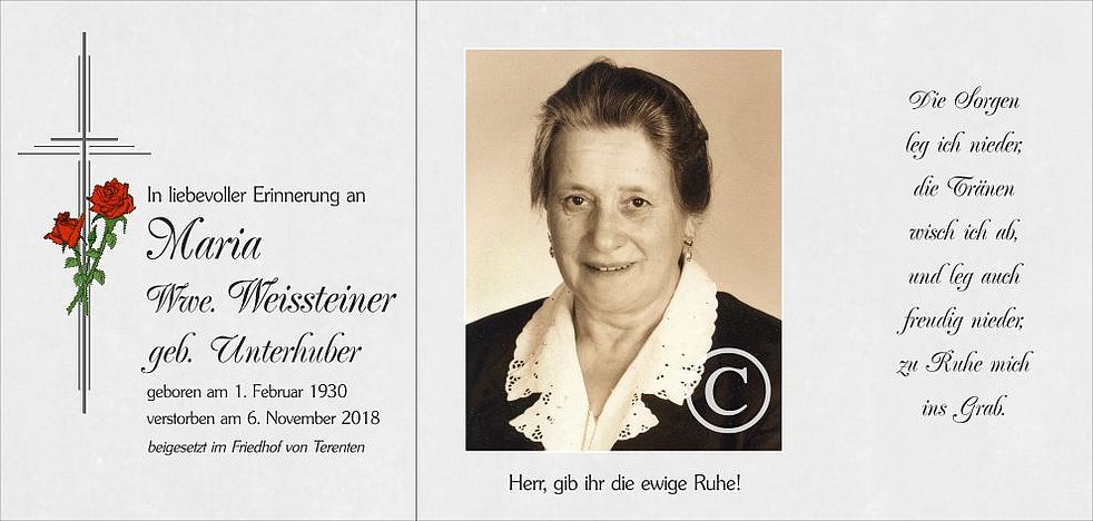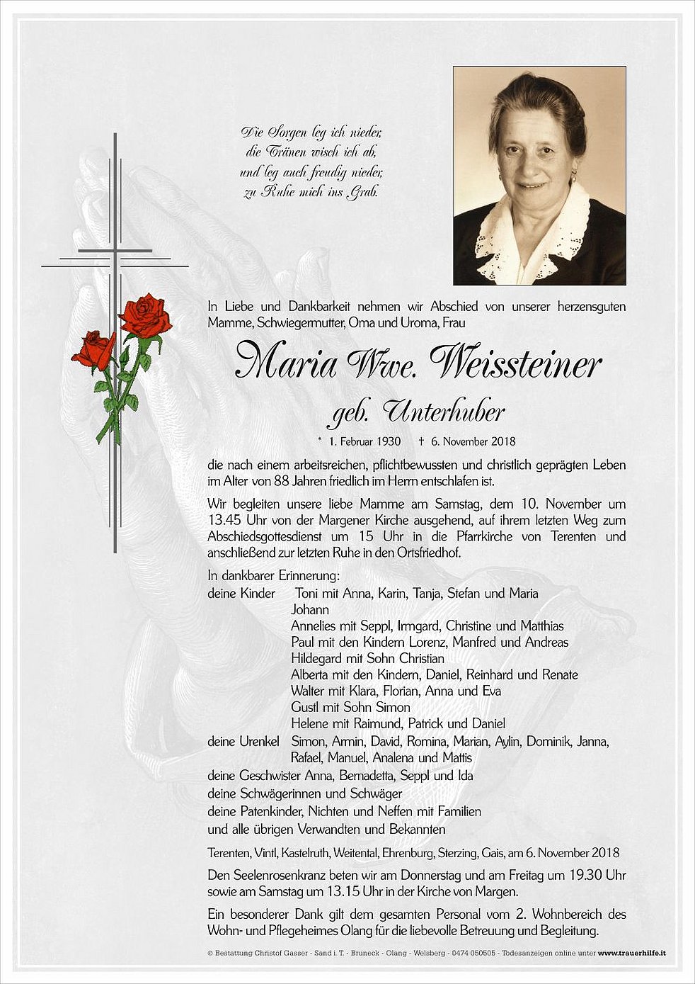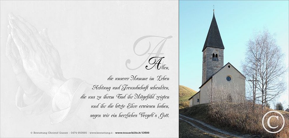 Wir begleiten unsere liebe Mamme am Samstag, dem 10. November um 13.45 Uhr von der Margener Kirche ausgehend, auf ihrem letzten Weg zum Abschiedsgottesdienst um 15 Uhr in die Pfarrkirche von Terenten und anschließend zur letzten Ruhe in den Ortsfriedhof.