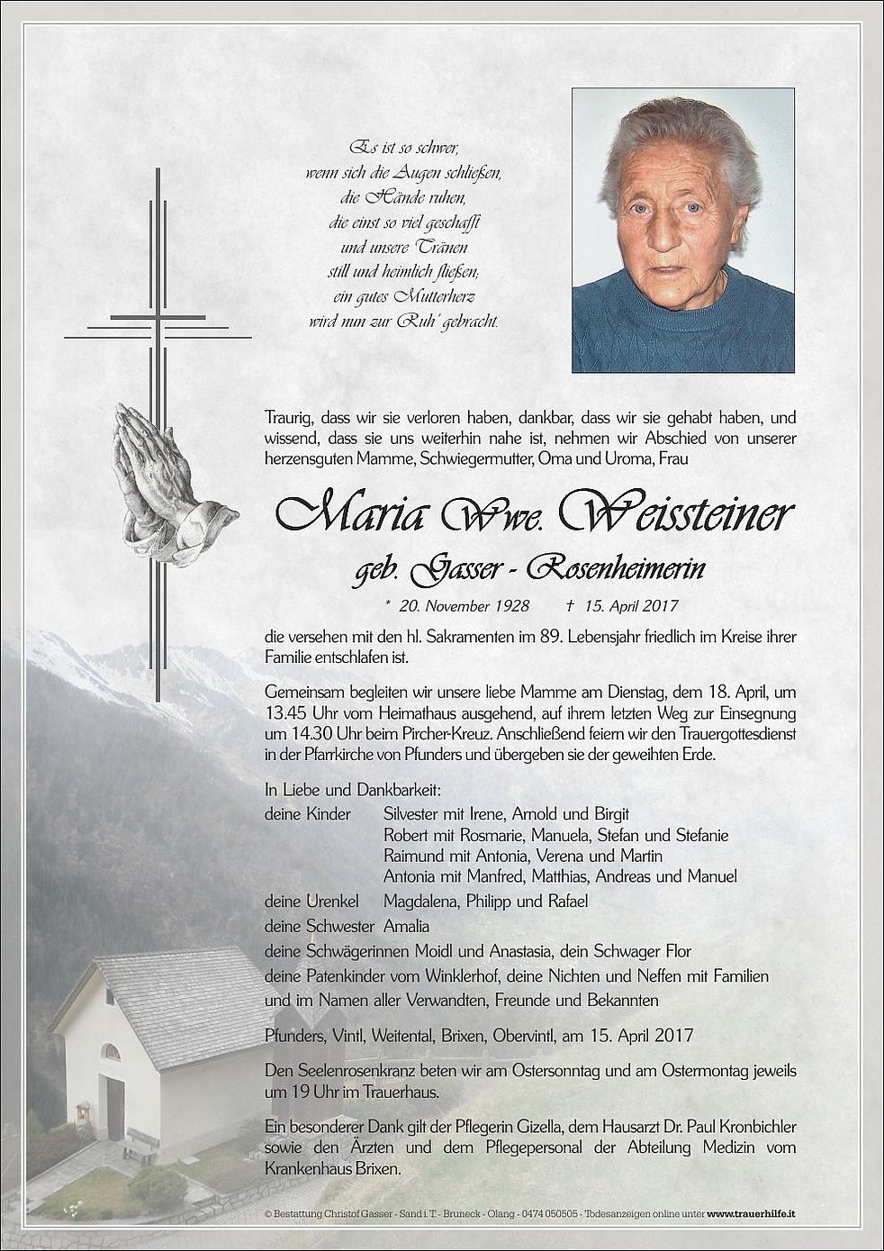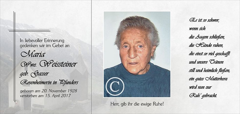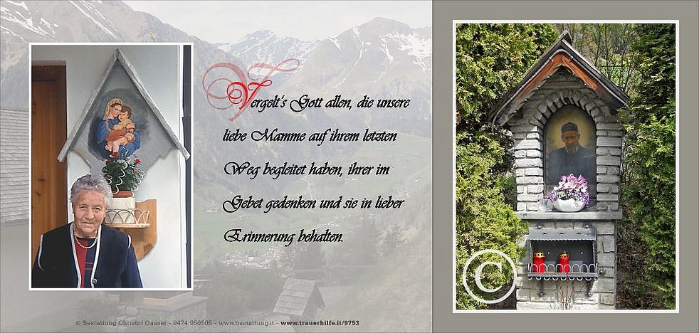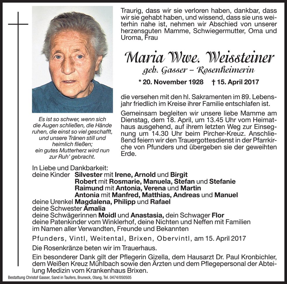 Gemeinsam begleiten wir unsere liebe Mamme am Dienstag, dem 18. April, um 13.45 Uhr vom Heimathaus ausgehend, auf ihrem letzten Weg zur Einsegnung um 14.30 Uhr beim Pircher-Kreuz. Anschließend feiern wir den Trauergottesdienst in der Pfarrkirche von Pfunders und übergeben sie der geweihten Erde.
