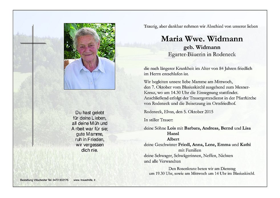 den 7. Oktober vom Blasiuskirchl ausgehend zum Mesner-Kreuz, wo um 14.30 Uhr die Einsegnung stattfindet. Anschließend erfolgt der Trauergottesdienst in der Pfarrkirche von Rodeneck und die Beisetzung im Ortsfriedhof.
