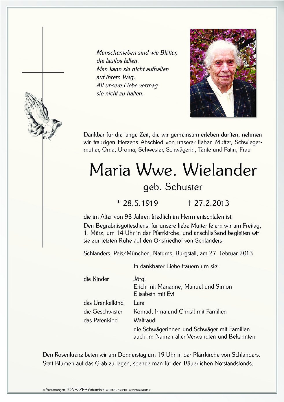 Den Begräbnisgottesdienst für unsere liebe Mutter feiern wir am Freitag, 1. März, um 14 Uhr in der Pfarrkirche, und anschließend begleiten wir sie zur letzten Ruhe auf den Ortsfriedhof von Schlanders.
