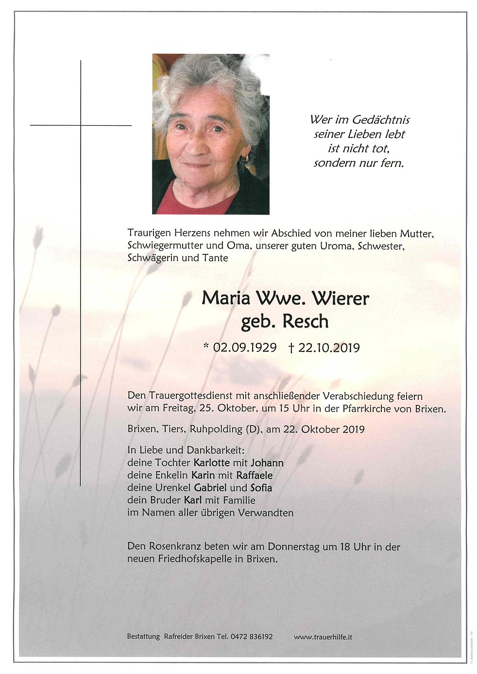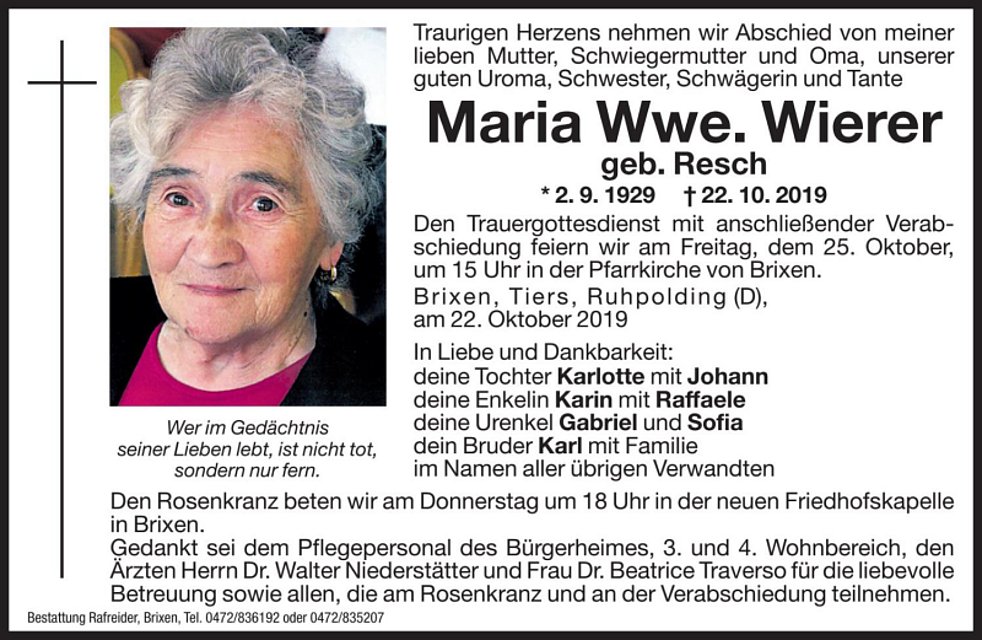 Gedankt sei dem Pflegepersonal des Bürgerheimes, 3. und 4. Wohnbereich, den Ärzten Dr. Walter Niederstätter und Frau Dr. Beatrice Traverso für die liebevolle Betreuung sowie allen, die am Rosenkranz und an der Verabschiedung teilnehmen.