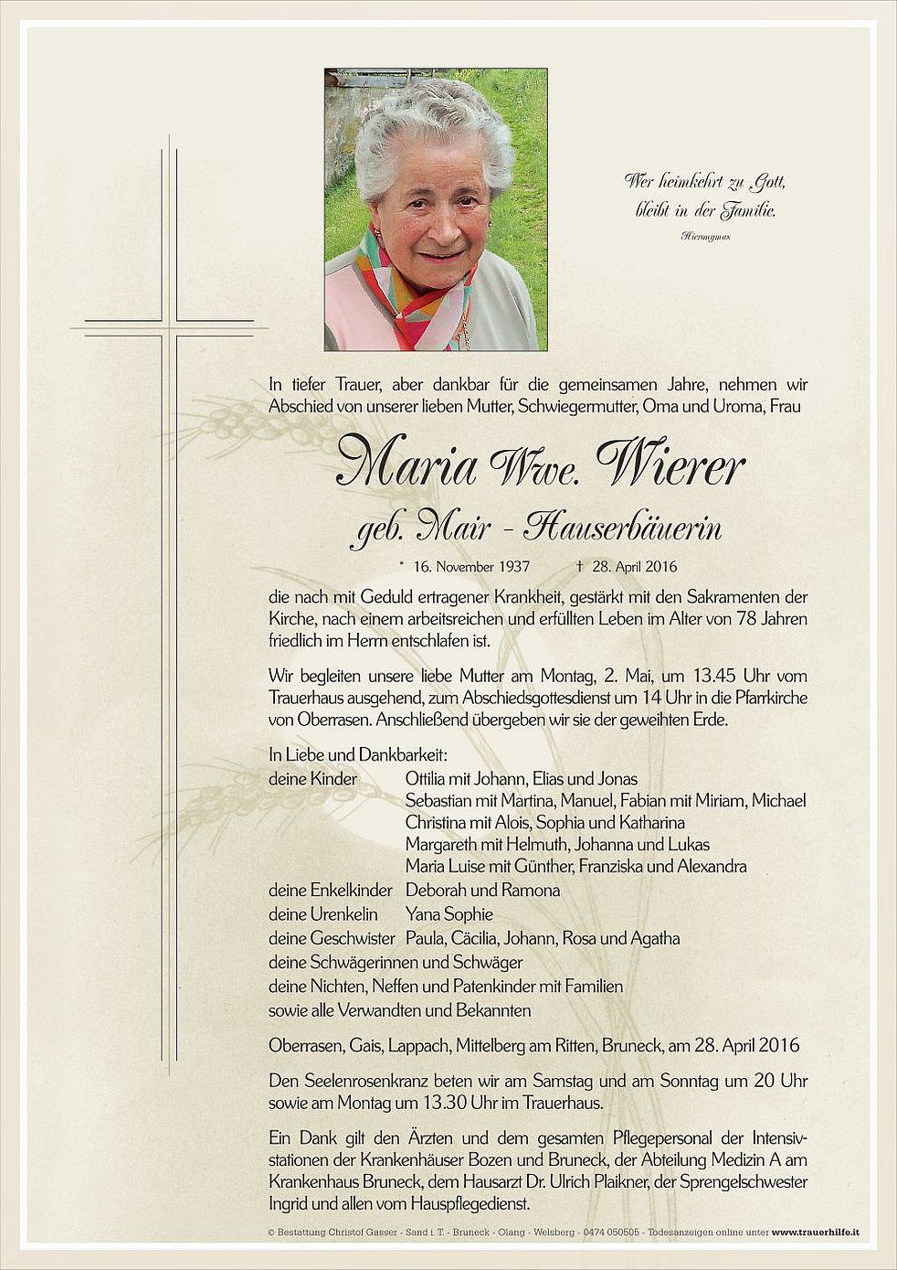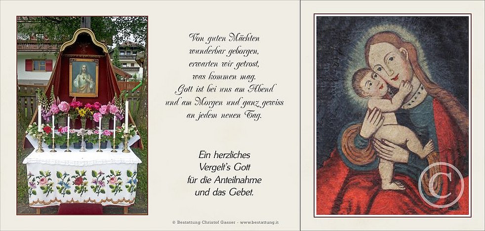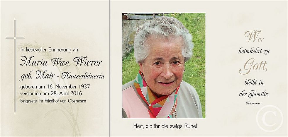 Wir begleiten unsere liebe Mutter am Montag, 2. Mai, um 13.45 Uhr vom Trauerhaus ausgehend, zum Abschiedsgottesdienst um 14 Uhr in die Pfarrkirche von Oberrasen. Anschließend übergeben wir sie der geweihten Erde.