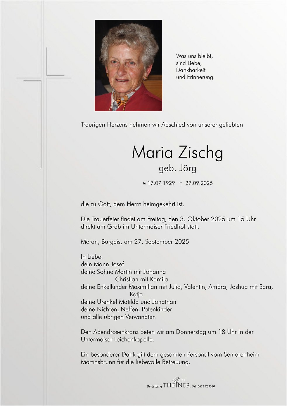 Die Trauerfeier findet am Freitag, den 3. Oktober 2025 um 15 Uhr direkt am Grab im Untermaiser Friedhof statt.