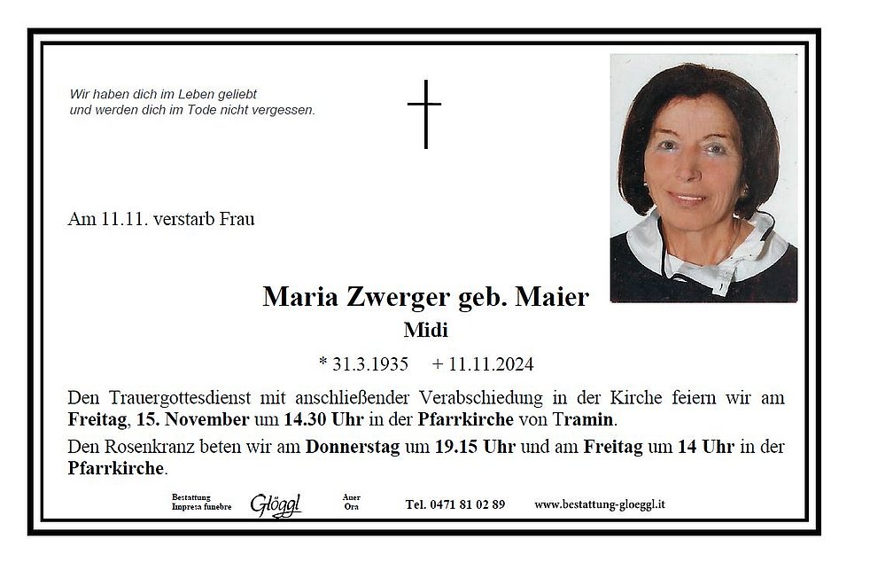 Trauerfeier: 15.11. - 14:30 Uhr Pfarrkirche Tramin