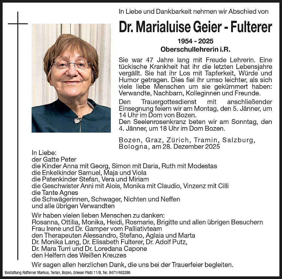 Den Trauergottesdienst mit anschließender Einsegnung feiern wir am Montag, den 5. Jänner, um 14 Uhr im Dom von Bozen.